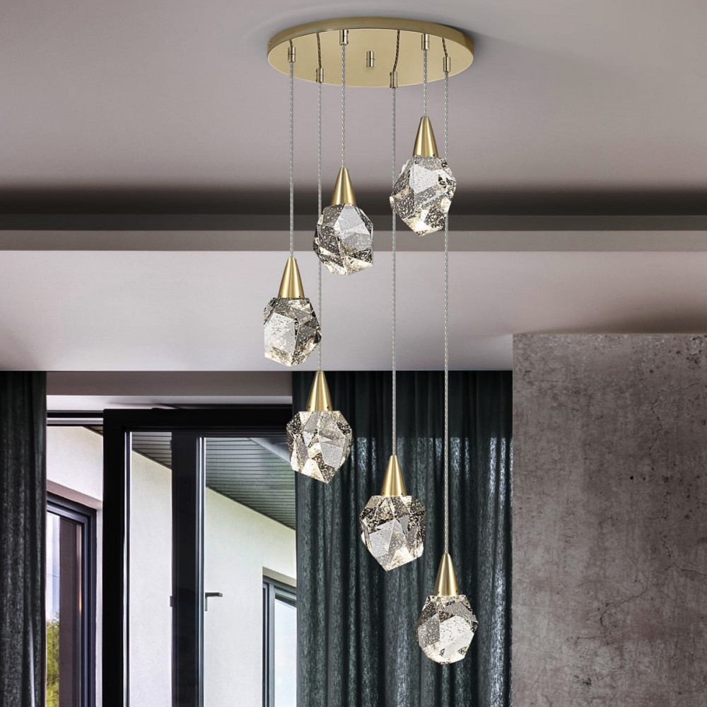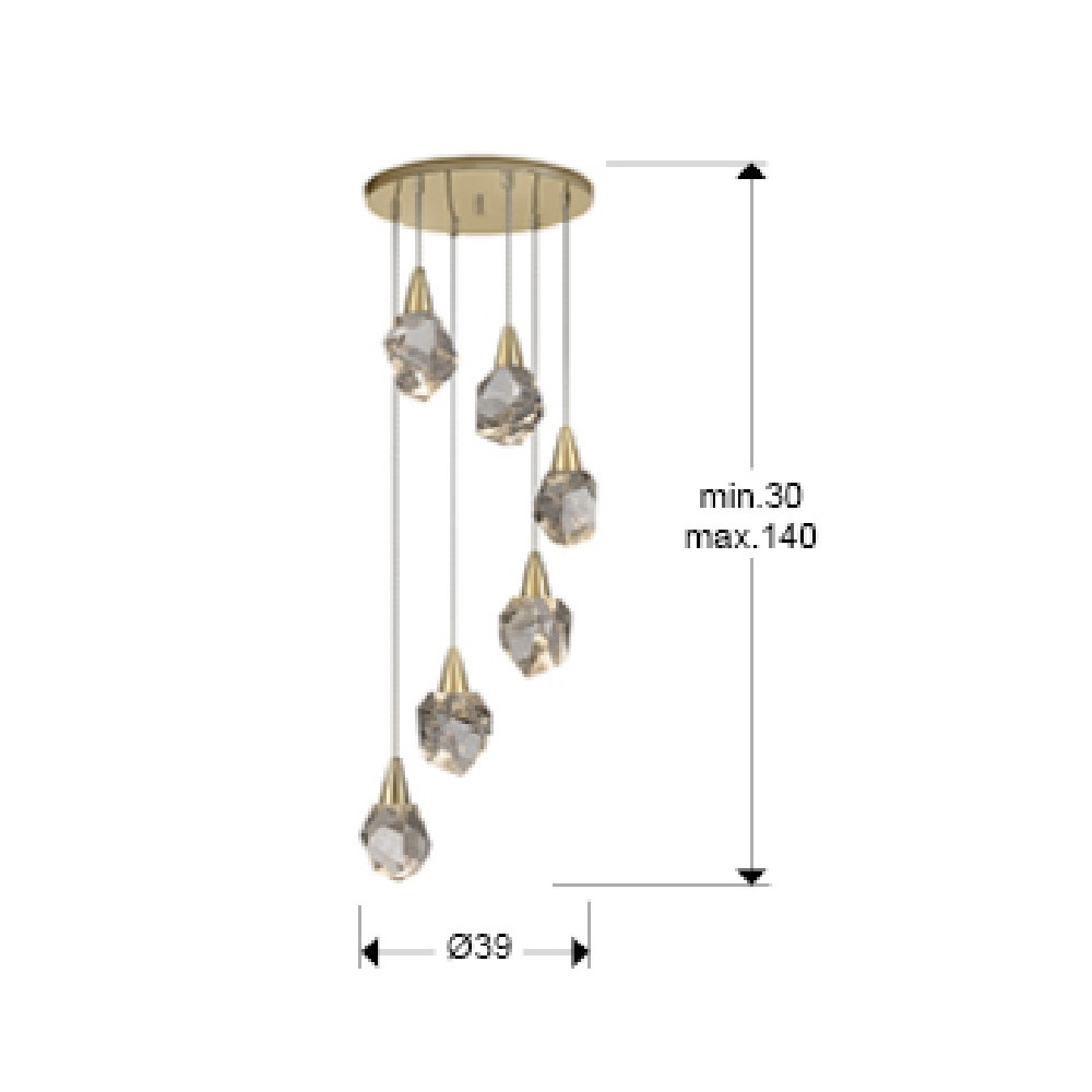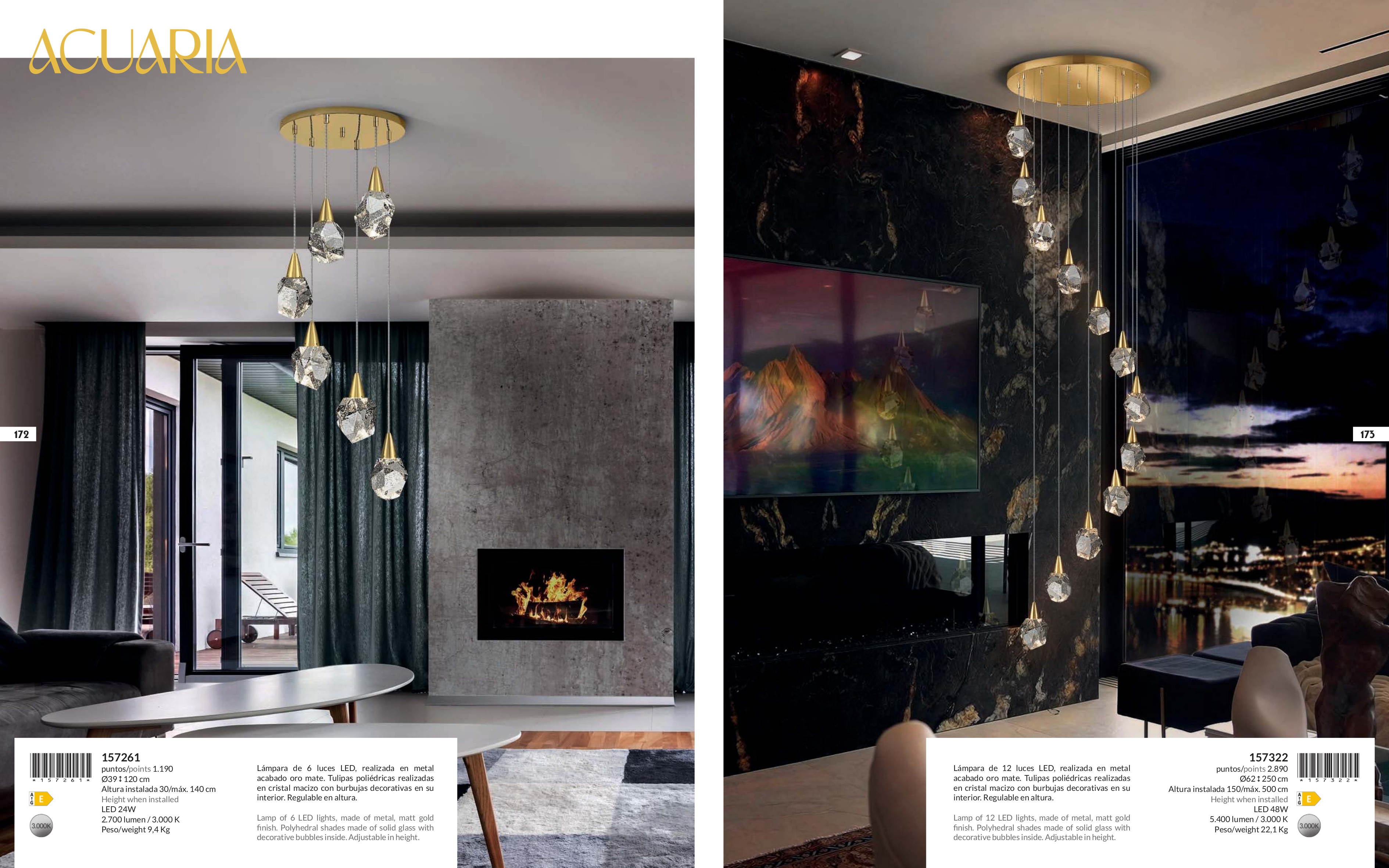 Осветителното тяло 157261 AQUARIA LAMP 6L MATT GOLD ще осигури комфорт и естетика във всяко помещение, в което се постави. Цялостната визия и дизайн на лампата и вложените в изработката й материали, като метал с матово златно покритие, многостенни абажури от масивно стъкло с декоративни балончета вътре, регулируема на височина, ще допринесат за един неповторим стил. Благодарение на дългогодишния опит, качествените материали и строгия контрол на качеството на изработка на производителя Schuller (Испания), 157261 AQUARIA LAMP 6L MATT GOLD е на високо европейско ниво.