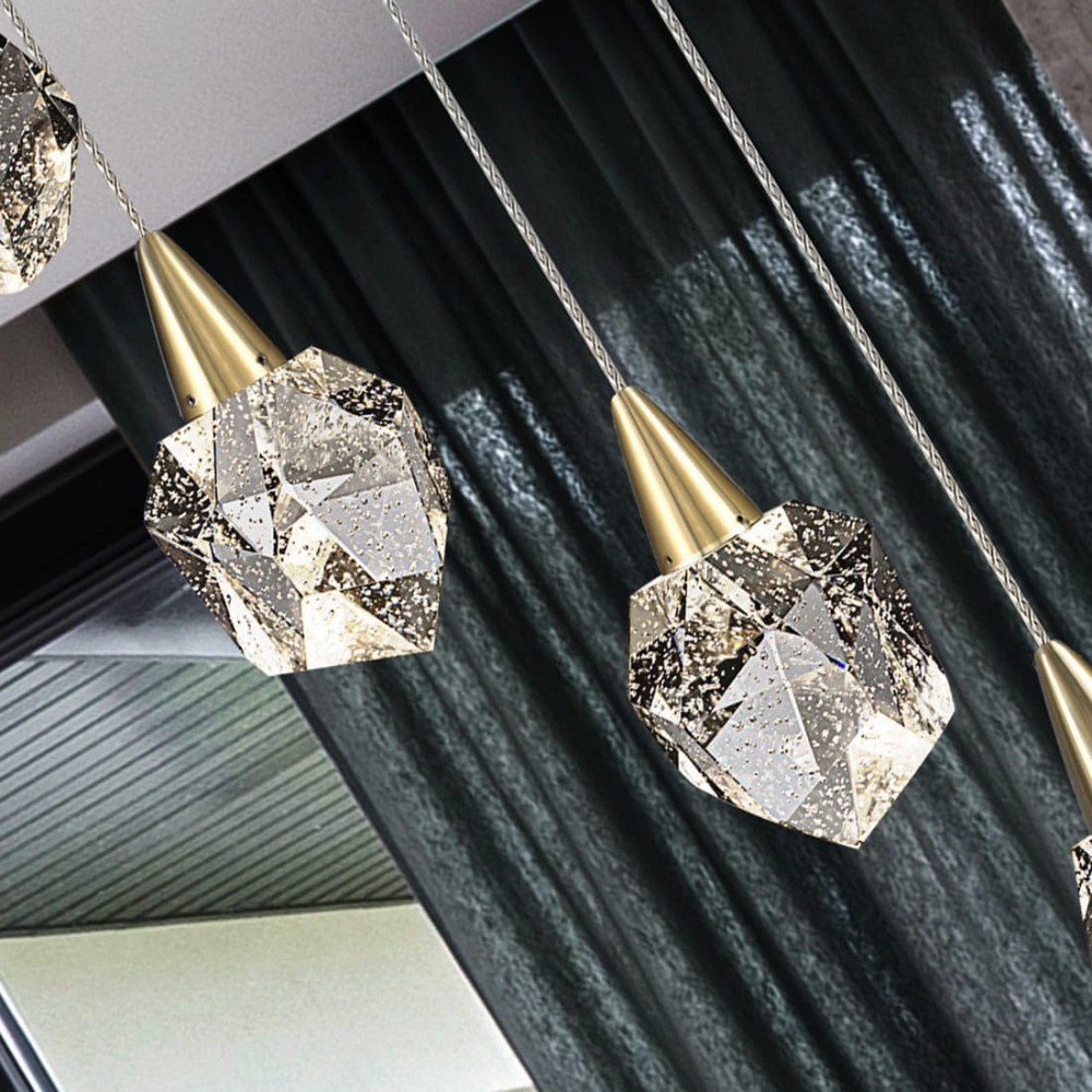 метал с матово златно покритие, многостенни абажури от масивно стъкло с декоративни балончета вътре, регулируема на височина