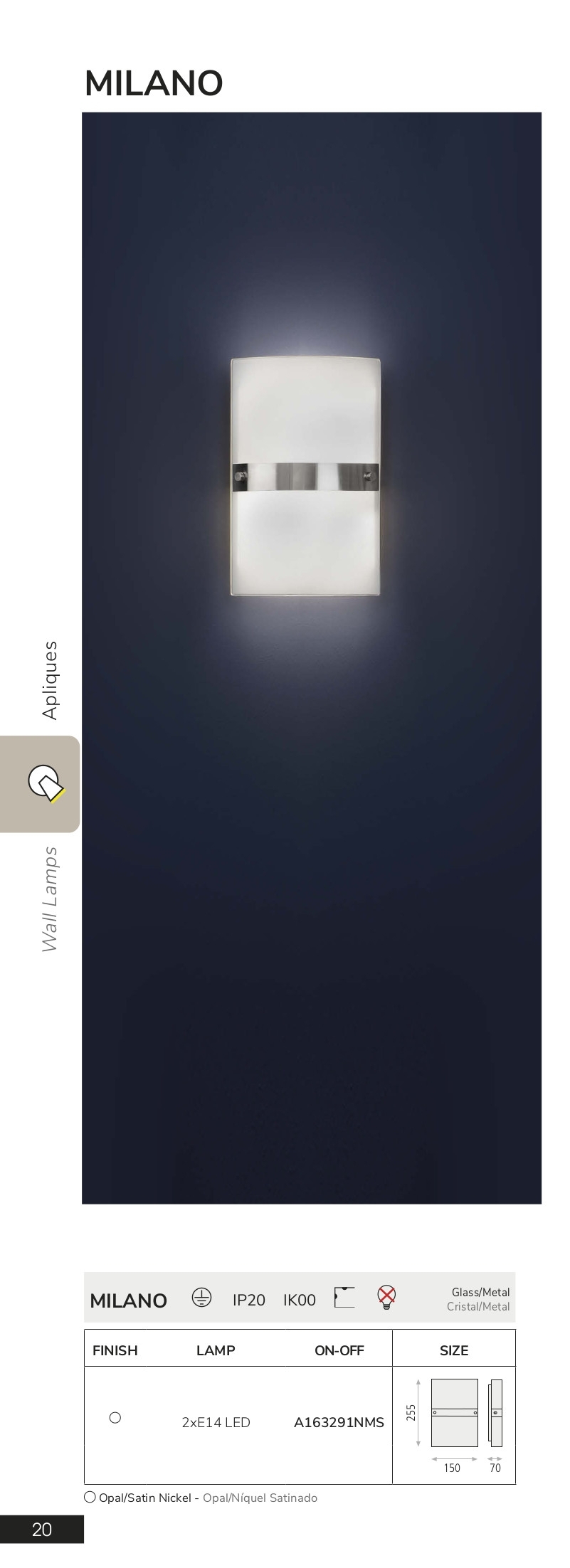 Осветителното тяло A163291NMS (16/329 E14 2x20W) представлява аплик в съвременен стил. A163291NMS (16/329 E14 2x20W) е от категорията осветителни тела и е подходящо за осветяване на различни помещения и пространства като: всекидневна / хол, спалня, кухня, трапезария, коридор, антре, стълбище, офис.