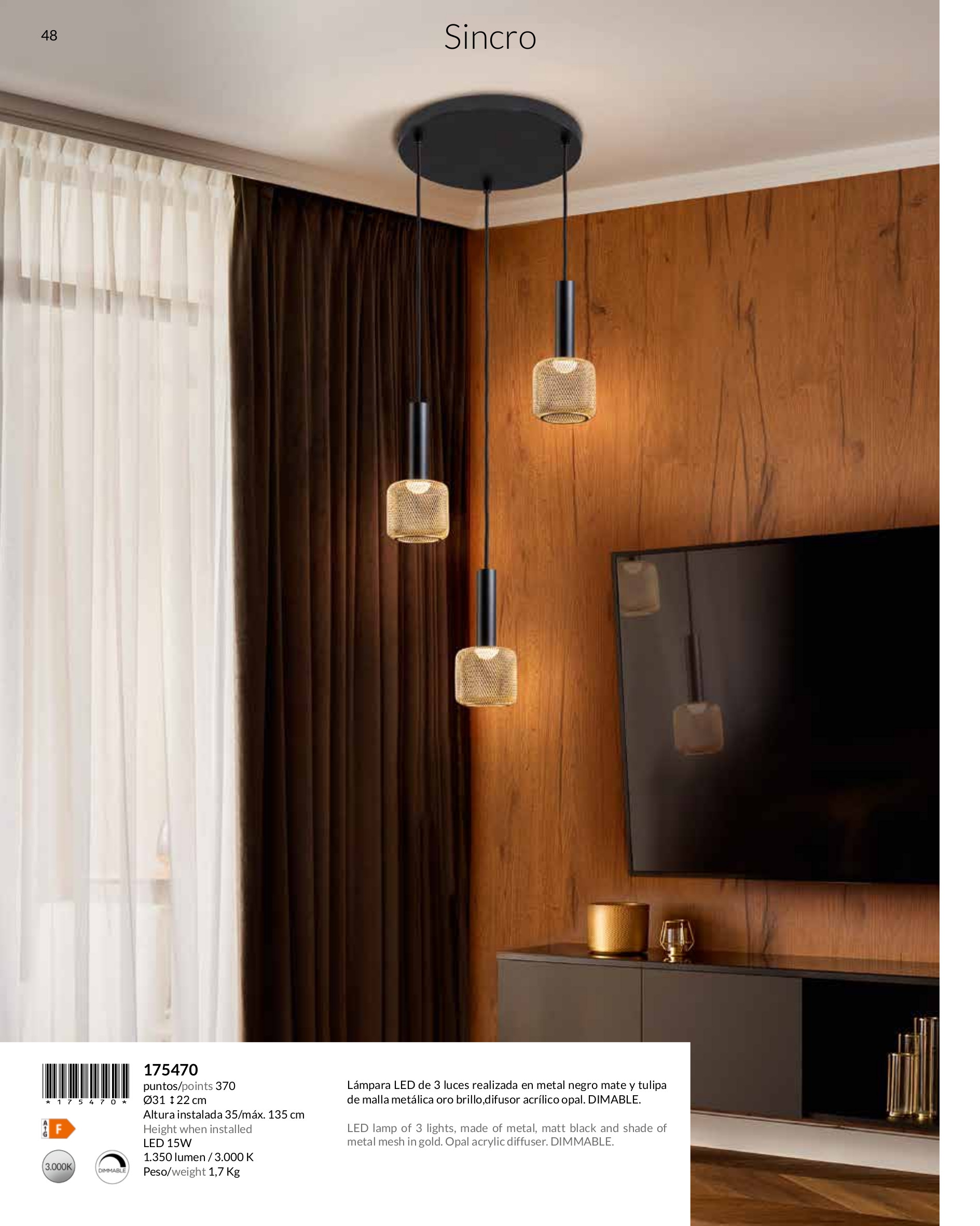 Осветителното тяло 175470 SINCRO LAMP 3L., BLACK/GOLD ще осигури комфорт и естетика във всяко помещение, в което се постави. Цялостната визия и дизайн на лампата и вложените в изработката й материали, като метал в цвят черен мат, абажури от метална мрежа в цвят злато, дифузьор от опалово бял полимер, ще допринесат за един неповторим стил. Благодарение на дългогодишния опит, качествените материали и строгия контрол на качеството на изработка на производителя Schuller (Испания), 175470 SINCRO LAMP 3L., BLACK/GOLD е на високо европейско ниво.