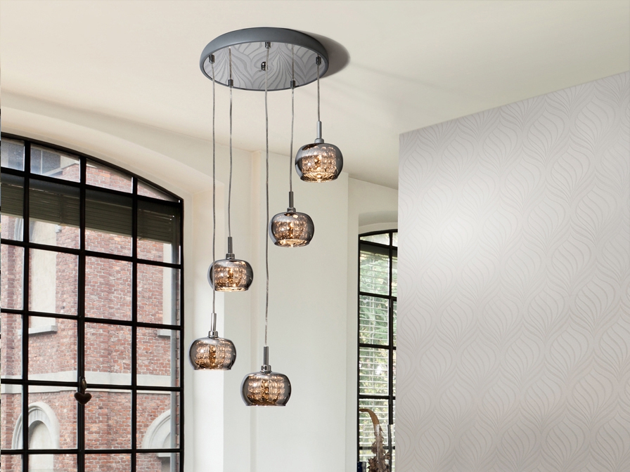 Лед полилей 193364 ARIAN PENDANT, 5L. ще осигури комфорт и естетика във всяко помещение, в което се постави. Цялостната визия и дизайн на led лампата и вложените в изработката й материали, като стомана с огледално покритие, блестящи стъклени абажури с нанизи от кристални мъниста вътре, ще допринесат за един неповторим стил. Благодарение на дългогодишния опит в производството на лед осветление, качествените материали и строгия контрол на качеството на изработка на производителя Schuller (Испания), 193364 ARIAN PENDANT, 5L. е на високо европейско ниво.