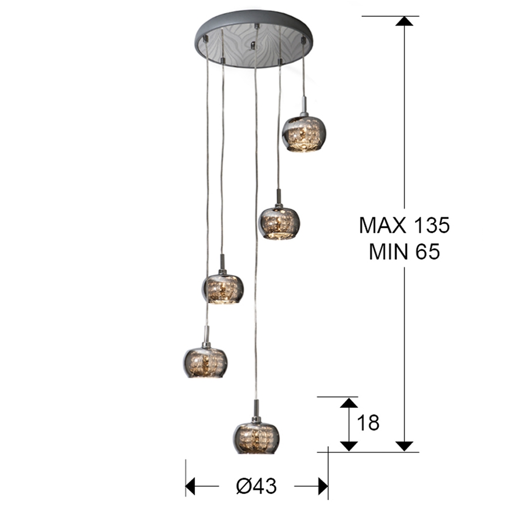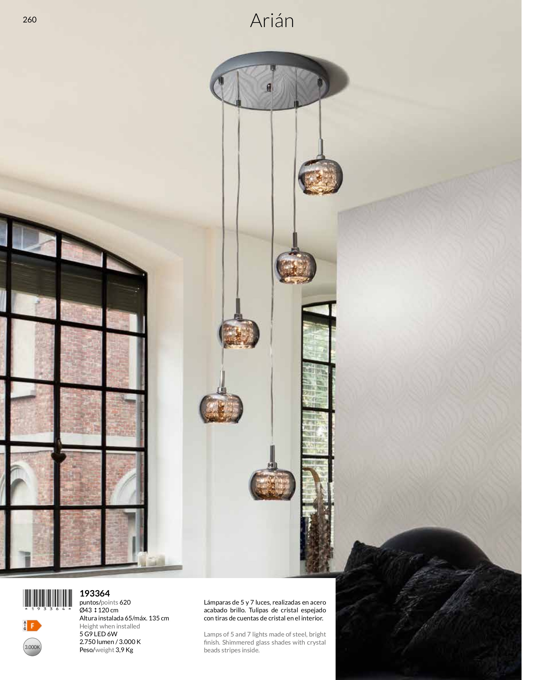 Лед полилей 193364D ARIAN LAMP 5L., DIMMABLE ще осигури комфорт и естетика във всяко помещение, в което се постави. Цялостната визия и дизайн на led лампата и вложените в изработката й материали, като стомана с огледално покритие, блестящи стъклени абажури с нанизи от кристални мъниста вътре, димируем, включено дистанционно управление, ще допринесат за един неповторим стил. Благодарение на дългогодишния опит в производството на лед осветление, качествените материали и строгия контрол на качеството на изработка на производителя Schuller (Испания), 193364D ARIAN LAMP 5L., DIMMABLE е на високо европейско ниво.