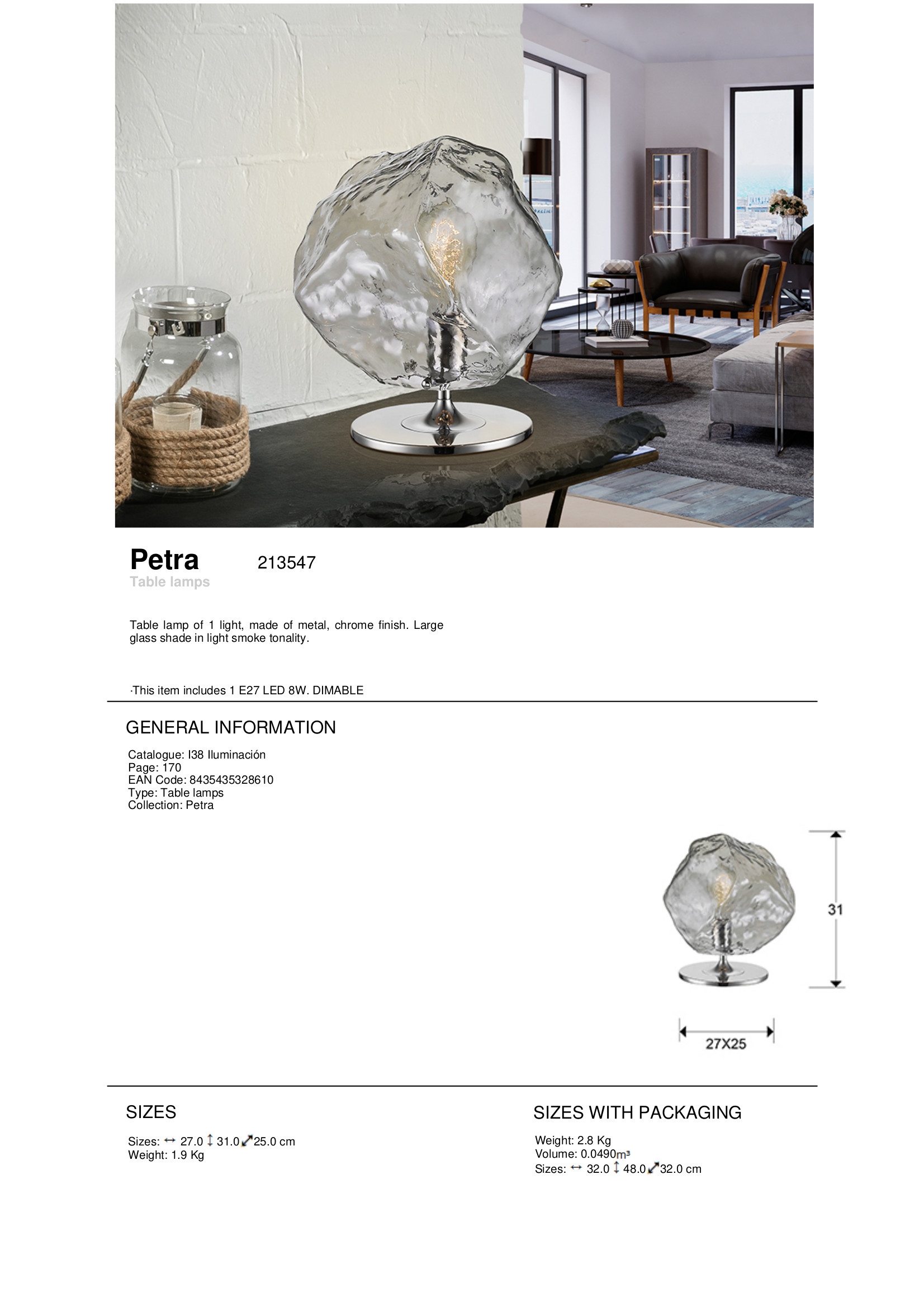 Лед настолна лампа 213547 PETRA TABLE LAMP 1L., CHROME, E27 ще осигури комфорт и естетика във всяко помещение, в което се постави. Цялостната визия и дизайн на led лампата и вложените в изработката й материали, като хромиран метал, стъклен абажур в леко опушена тоналност, ще допринесат за един неповторим стил. Благодарение на дългогодишния опит в производството на лед осветление, качествените материали и строгия контрол на качеството на изработка на производителя Schuller (Испания), 213547 PETRA TABLE LAMP 1L., CHROME, E27 е на високо европейско ниво.