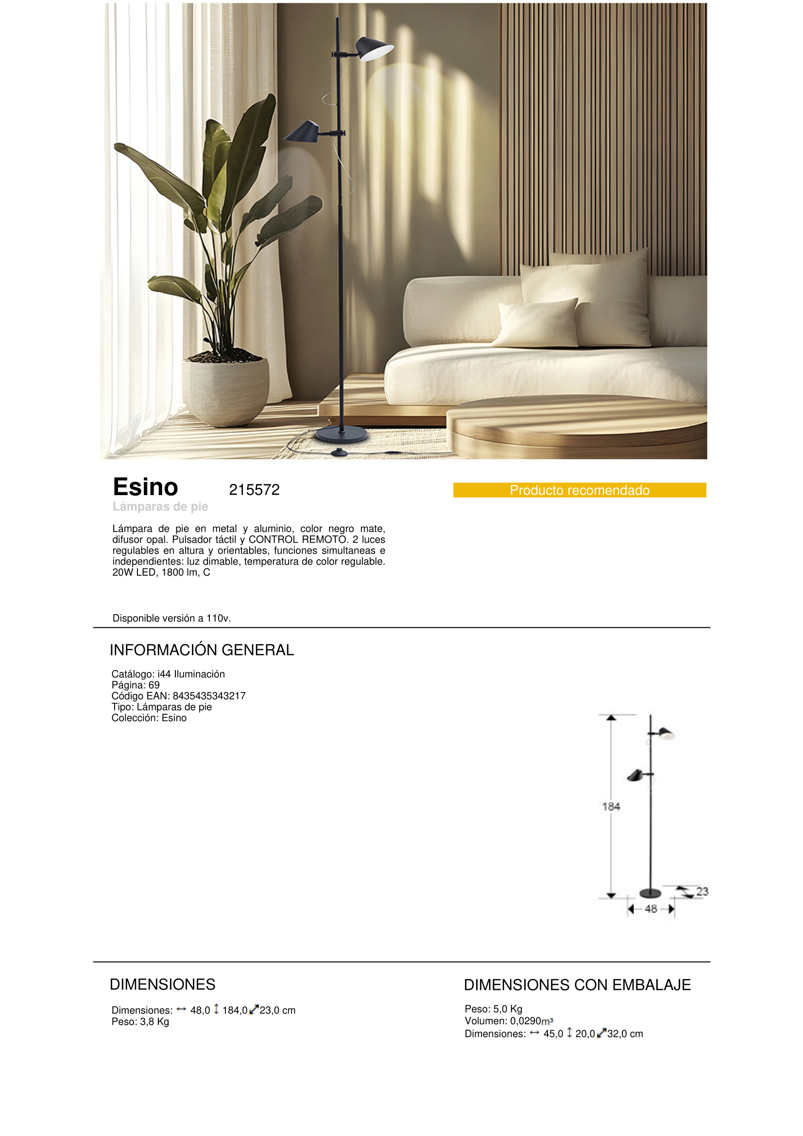 Осветителното тяло 215572 ESINO - FLOOR LAMP 2L BLACK представлява лед лампион / правостояща лампа в съвременен стил. 215572 ESINO - FLOOR LAMP 2L BLACK е от категорията и е подходящо за осветяване на различни помещения и пространства като: всекидневна / хол, спалня, трапезария, офис.
