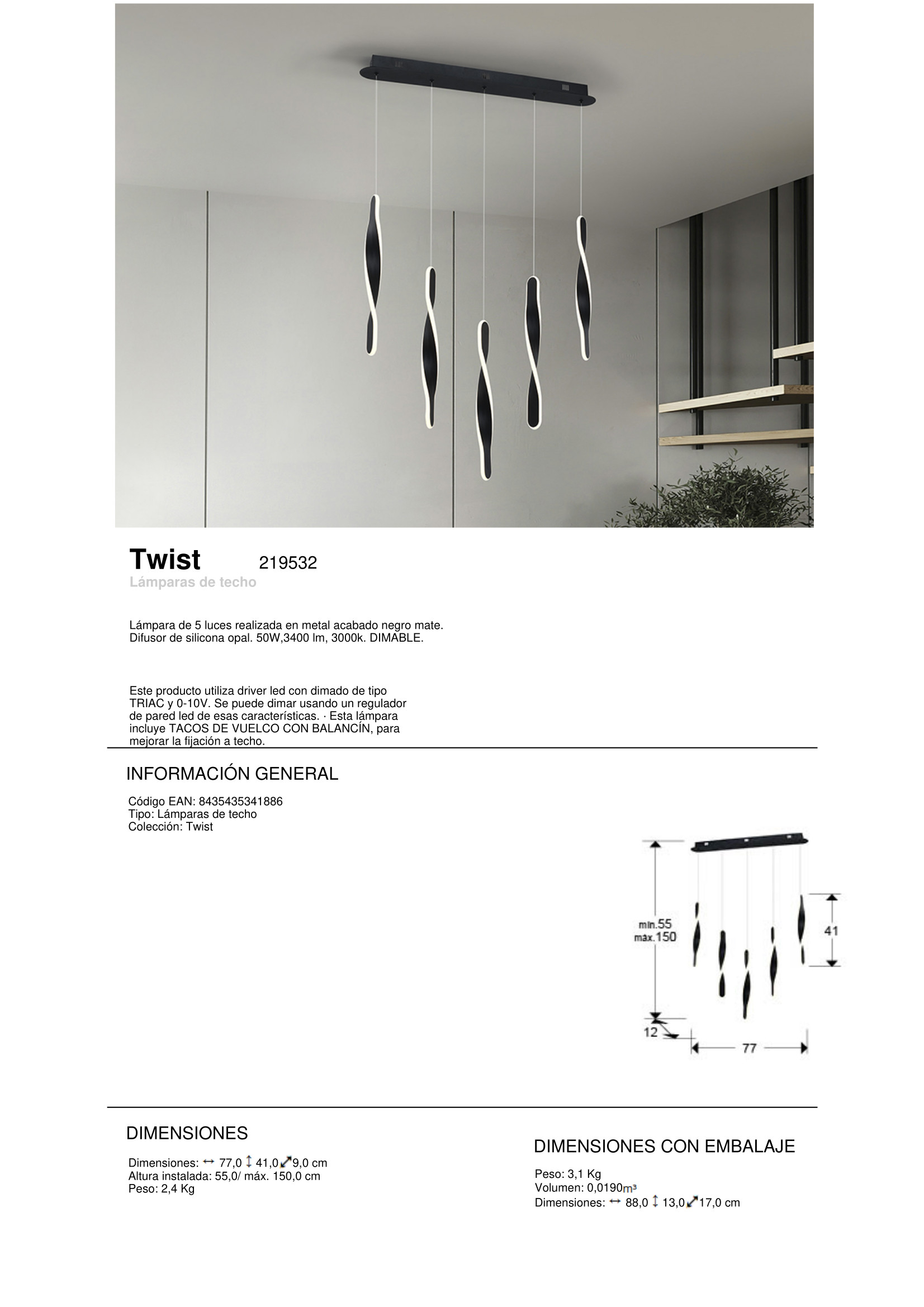 Осветителното тяло 219532 TWIST - LAMP 5L BLACK ще осигури комфорт и естетика във всяко помещение, в което се постави. Цялостната визия и дизайн на лампата и вложените в изработката й материали, като метал с матово черно покритие, опалов силиконов разсейвател на светлината, ще допринесат за един неповторим стил. Благодарение на дългогодишния опит, качествените материали и строгия контрол на качеството на изработка на производителя Schuller (Испания), 219532 TWIST - LAMP 5L BLACK е на високо европейско ниво.