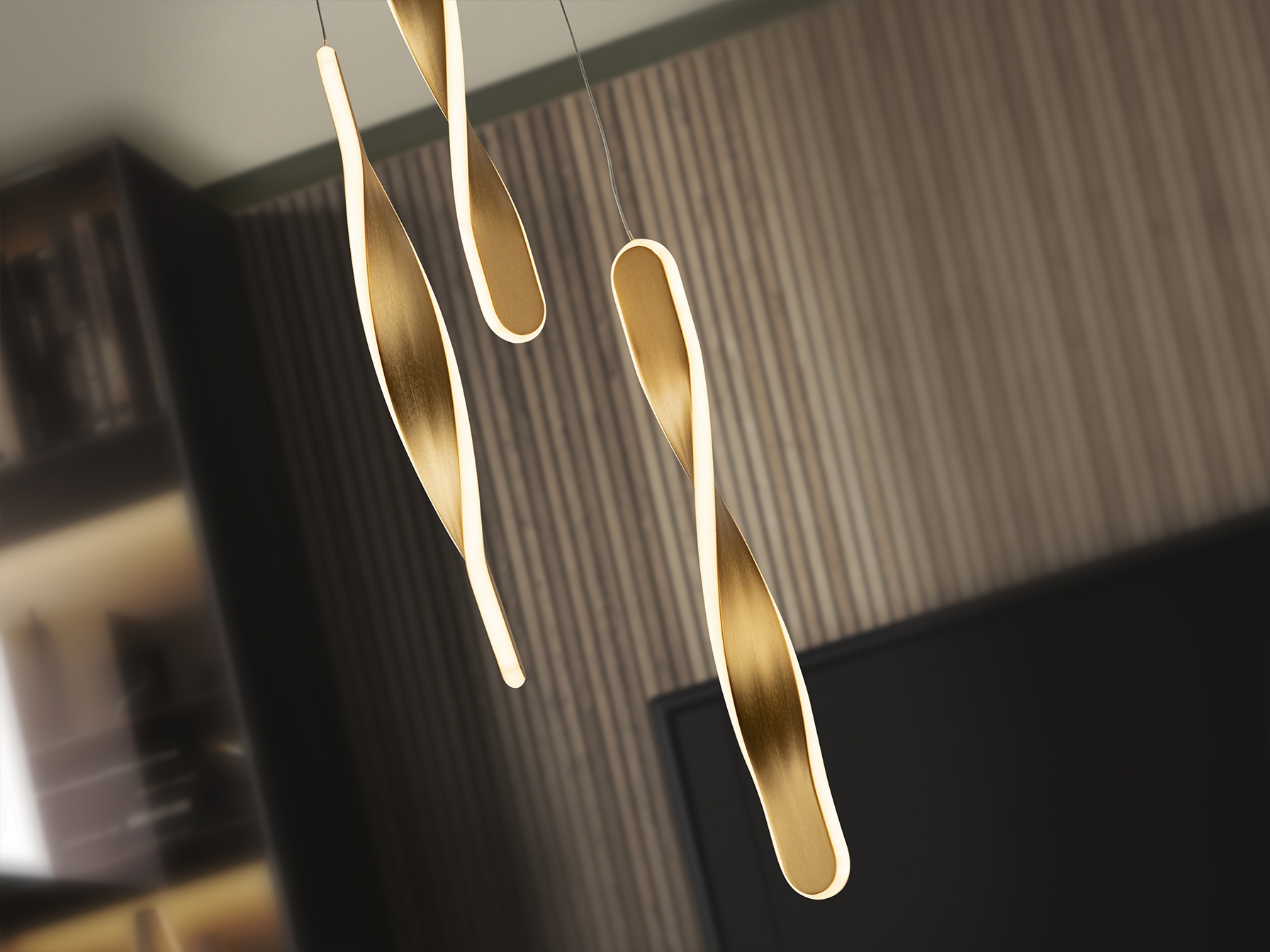 Осветителното тяло 219633 TWIST - LAMP 1L GOLD 11W 800LM 3000K представлява лед пендел в съвременен, дизайнерски стил. 219633 TWIST - LAMP 1L GOLD 11W 800LM 3000K е от категорията и е подходящо за осветяване на различни помещения и пространства като: всекидневна / хол, спалня, кухня, трапезария, коридор, антре, офис.
