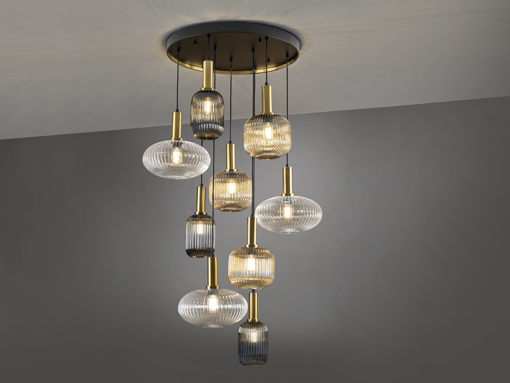 Осветителното тяло 225090 NORMA LAMP 9L BLACK/BRASS ще осигури комфорт и естетика във всяко помещение, в което се постави. Цялостната визия и дизайн на лампата и вложените в изработката й материали, като метал в матово черен цвят, детайли от сатениран месинг, абажури от релефно прозрачно, с цвят кехлибар и опушено огледално сиво стъкло, ще допринесат за един неповторим стил. Благодарение на дългогодишния опит, качествените материали и строгия контрол на качеството на изработка на производителя Schuller (Испания), 225090 NORMA LAMP 9L BLACK/BRASS е на високо европейско ниво.