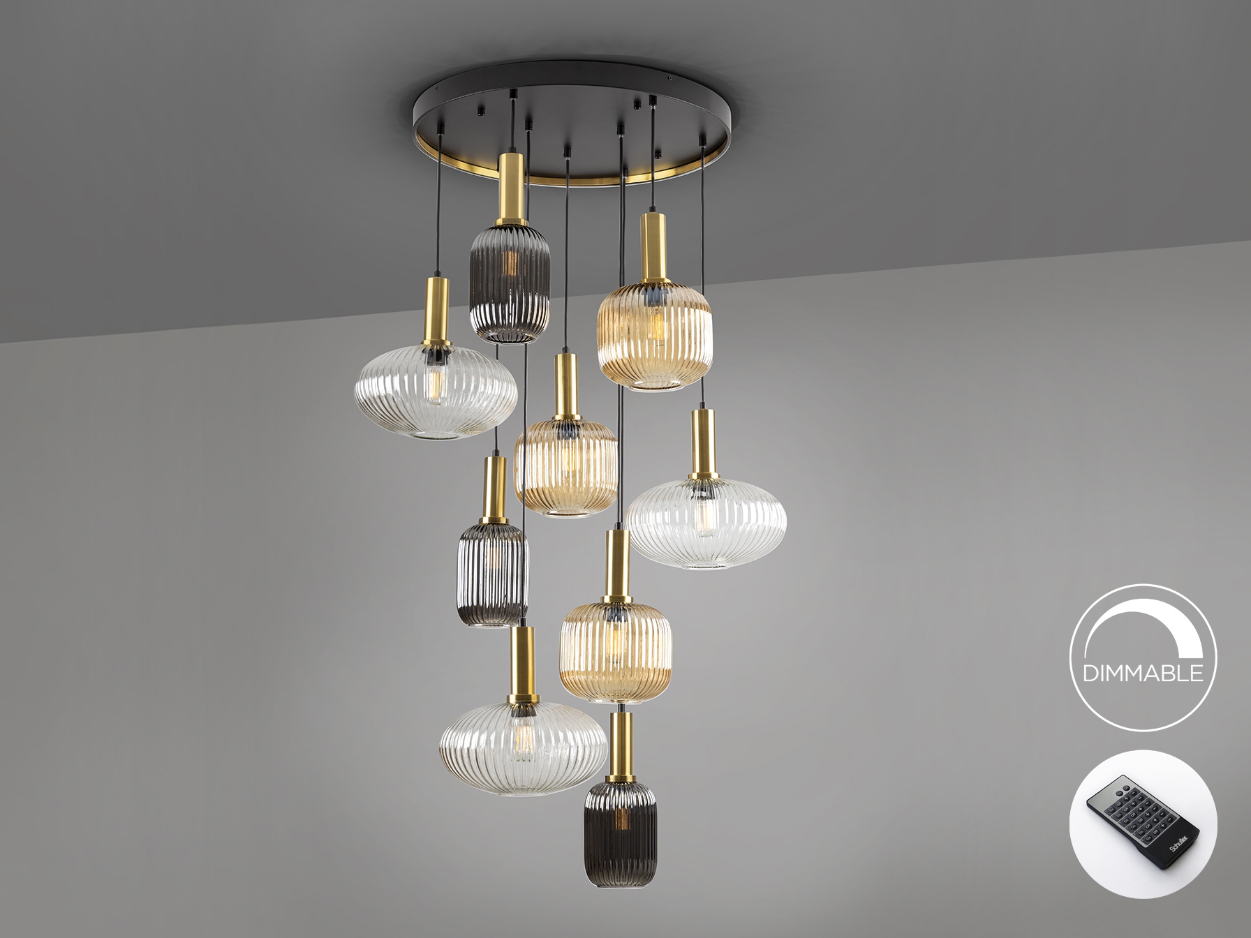 метал в матово черен цвят, детайли от сатениран месинг, абажури от релефно стъкло в прозрачен, кехлибарен и опушено сив цвят, дистанционно управление