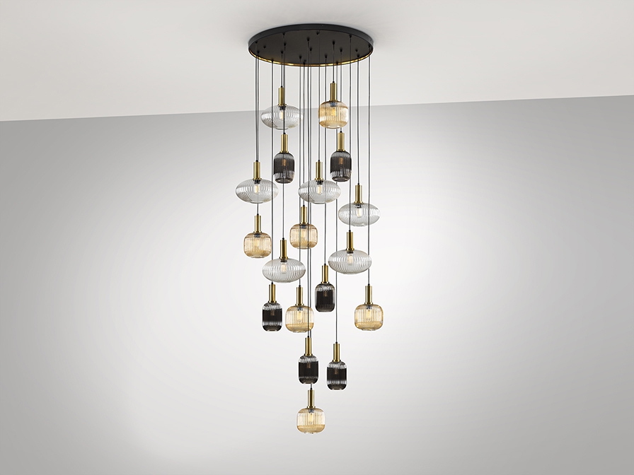 За стила и естетиката на интериора допринасят, както цялостната визия и дизайн на осветителното тяло, така и вложените от производителя в изработката висококачествени материали, като метал, завършен в матово черно с детайли от сатениран месинг, формовани стъклени абажури в прозрачно, кехлибарено и опушено блестящо сиво, регулируема дължина.