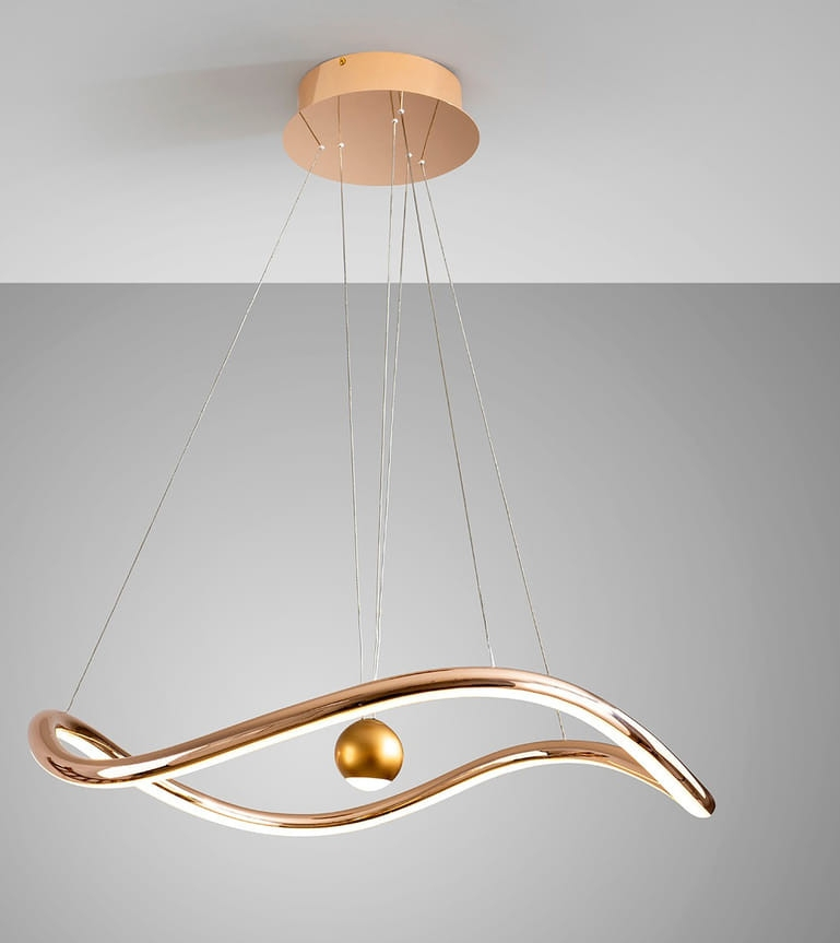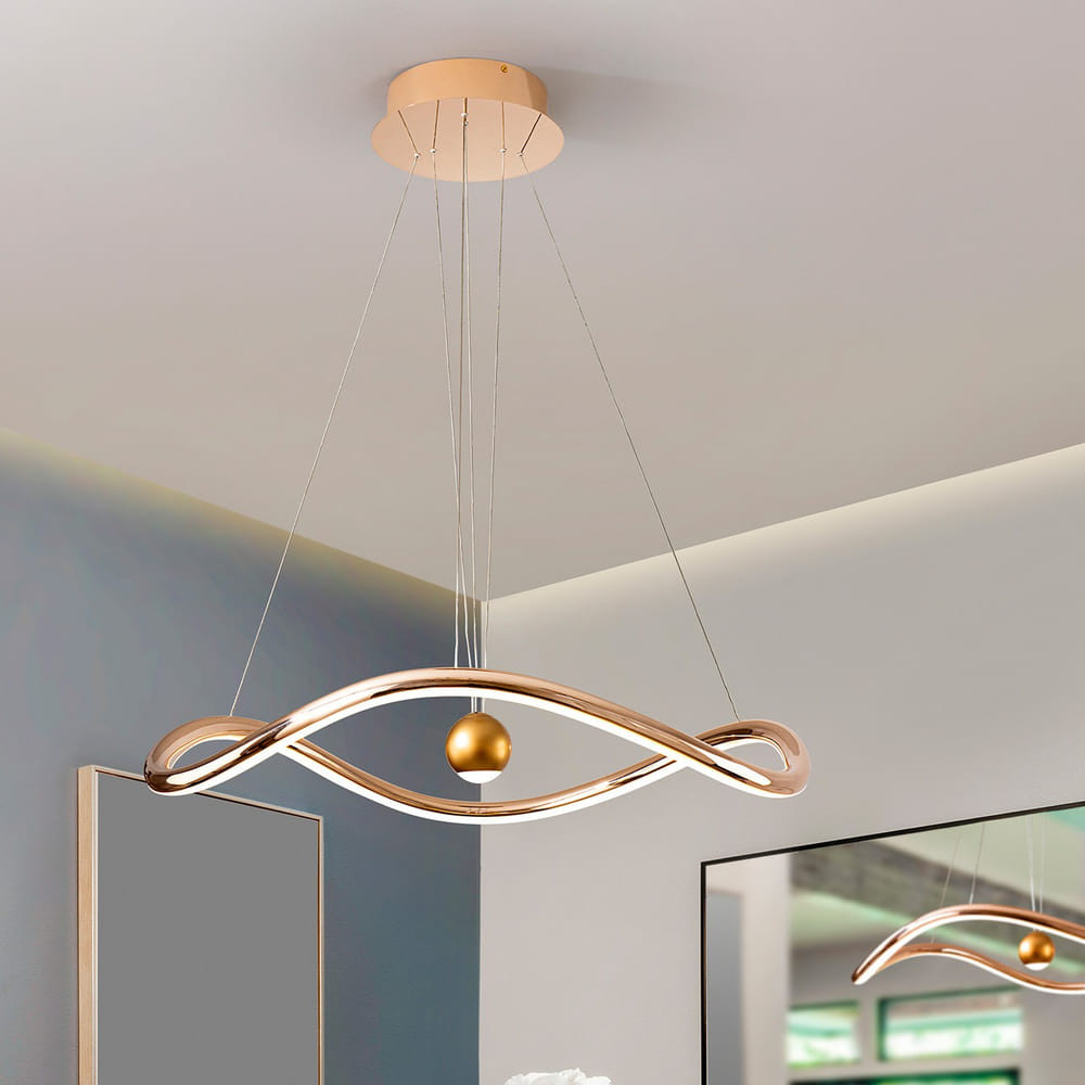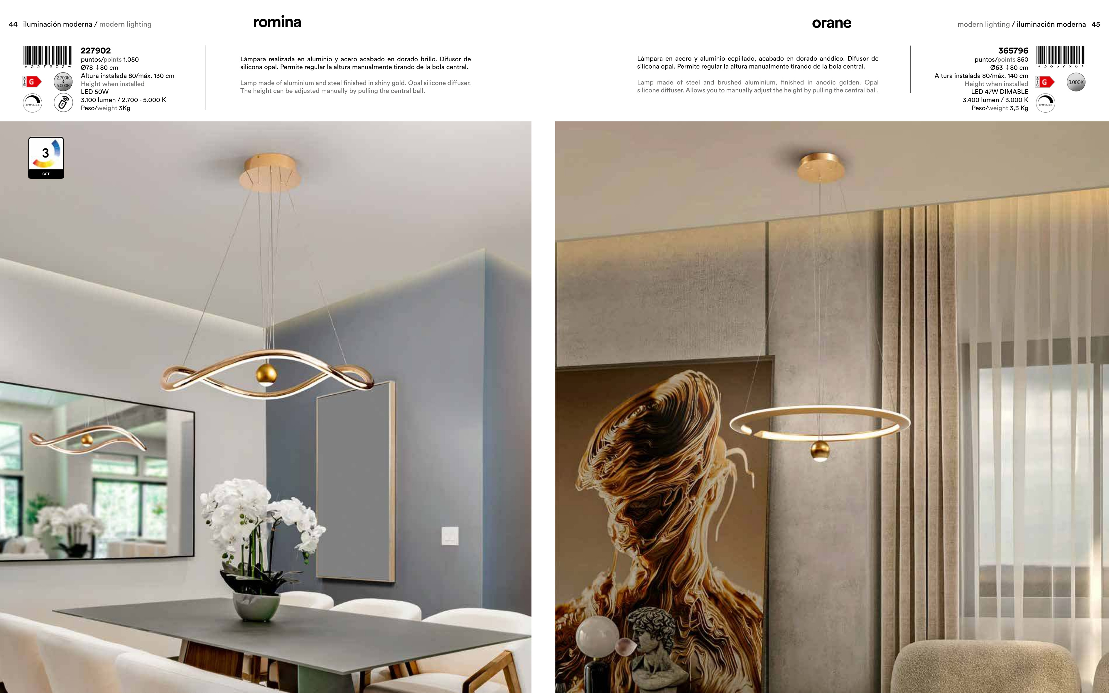 Лед полилей 227902 ROMINA ще осигури комфорт и естетика във всяко помещение, в което се постави. Цялостната визия и дизайн на led лампата и вложените в изработката й материали, като алуминий и стомана с лъскаво златно покритие, опалов силиконов разсейвател, височината може да се регулира ръчно чрез издърпване на централната топка, димируема, CCT 2700-5000K, ще допринесат за един неповторим стил. Благодарение на дългогодишния опит в производството на лед осветление, качествените материали и строгия контрол на качеството на изработка на производителя Schuller (Испания), 227902 ROMINA е на високо европейско ниво.