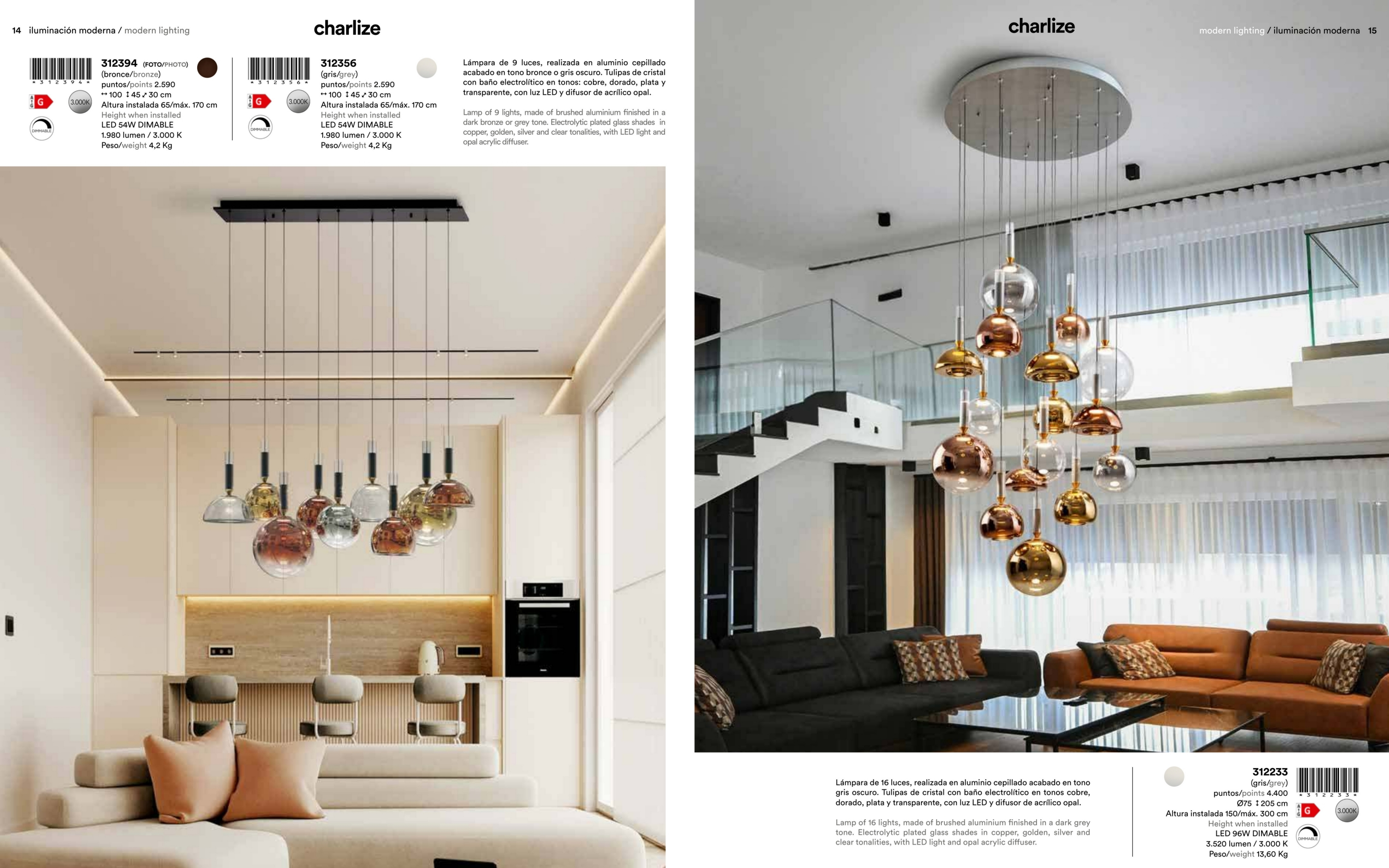 полиран алуминий с тъмно бронзово покритие, абажури от блестящо стъкло с електролитно покритие в медни, златни, сребристи и прозрачни тонове, опалов акрилен разсейвател, дистанционно за димиране