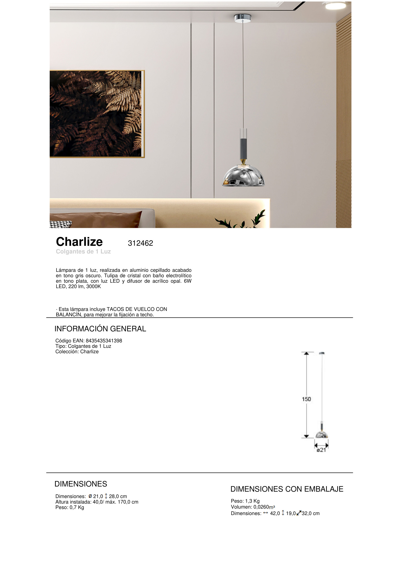 Осветителното тяло 312462 CHARLIZE - LAMP 1L SILVER представлява пендел в съвременен стил. 312462 CHARLIZE - LAMP 1L SILVER е от категорията осветителни тела и е подходящо за осветяване на различни помещения и пространства като: всекидневна / хол, спалня, кухня, трапезария, коридор, антре, офис.