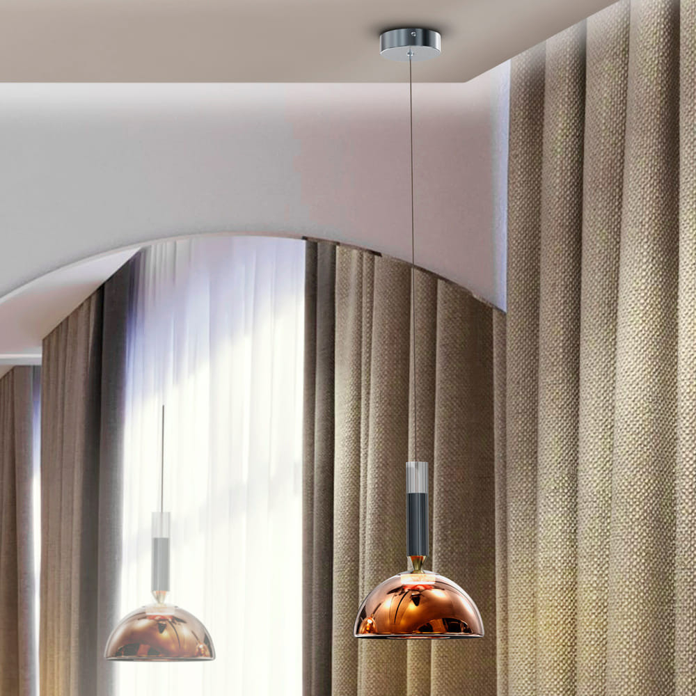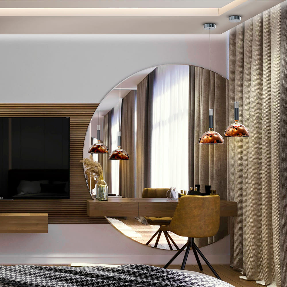 полиран алуминий с тъмно сиво покритие, абажури от блестящо стъкло с електролитно покритие в медна тоналност