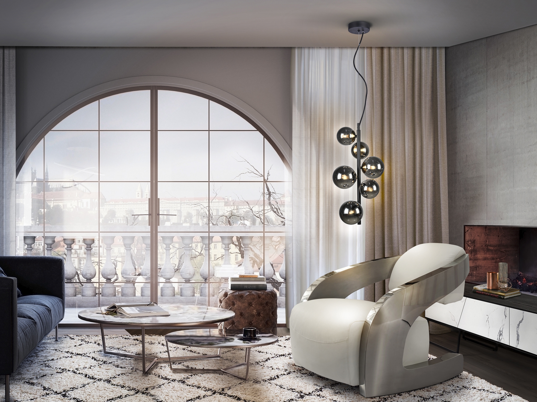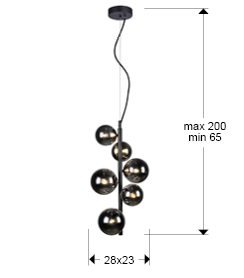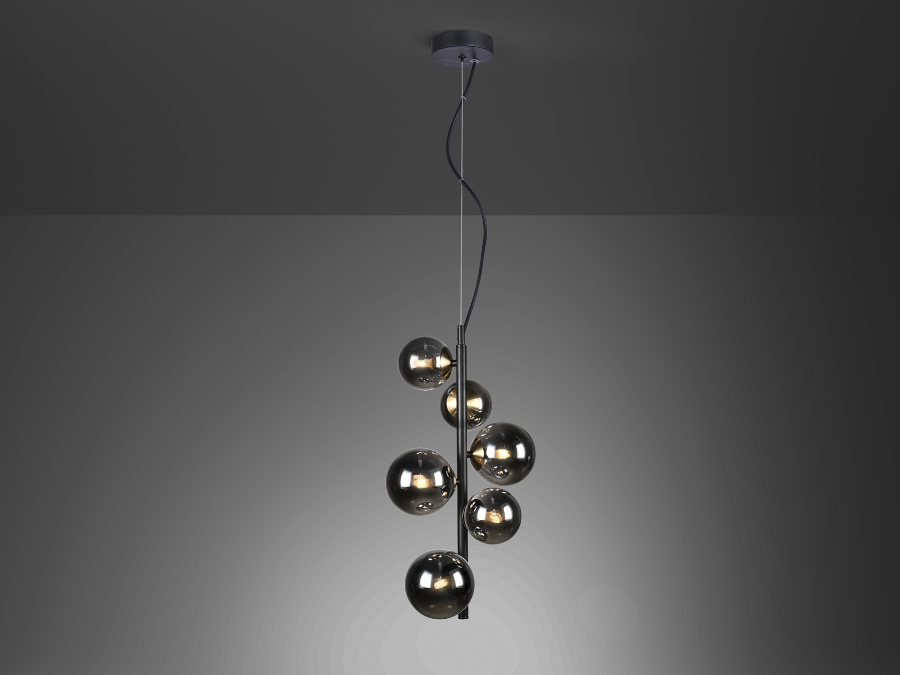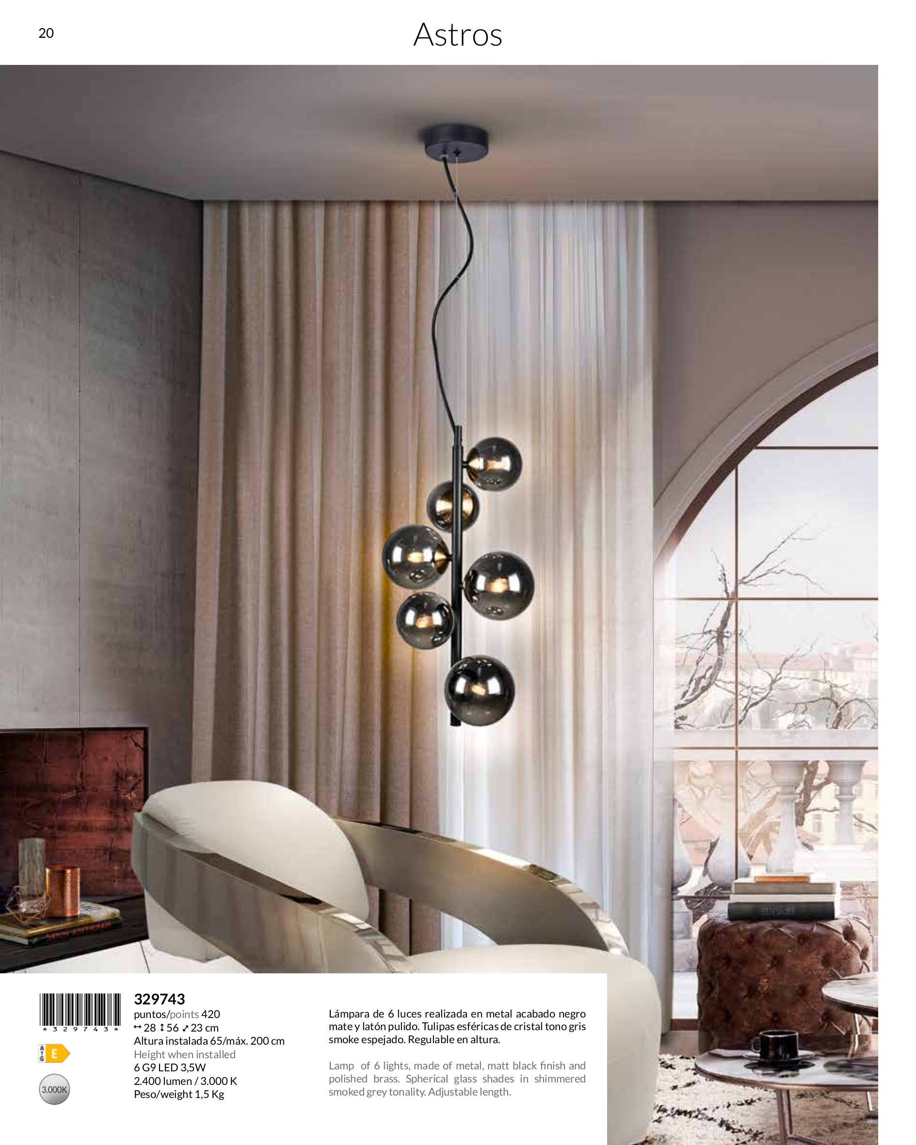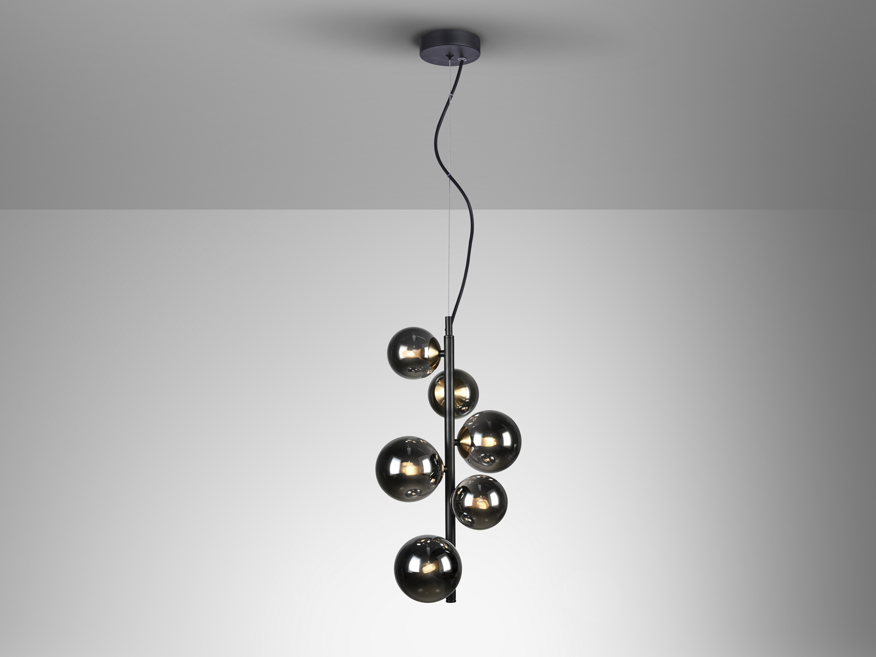 Осветителното тяло 329743 ASTROS LAMP 6L., BLACK ще осигури комфорт и естетика във всяко помещение, в което се постави. Цялостната визия и дизайн на лампата и вложените в изработката й материали, като метал в матово черно покритие, полиран месинг, сферични стъклени абажури в блестяща опушена сива тоналност, ще допринесат за един неповторим стил. Благодарение на дългогодишния опит, качествените материали и строгия контрол на качеството на изработка на производителя Schuller (Испания), 329743 ASTROS LAMP 6L., BLACK е на високо европейско ниво.