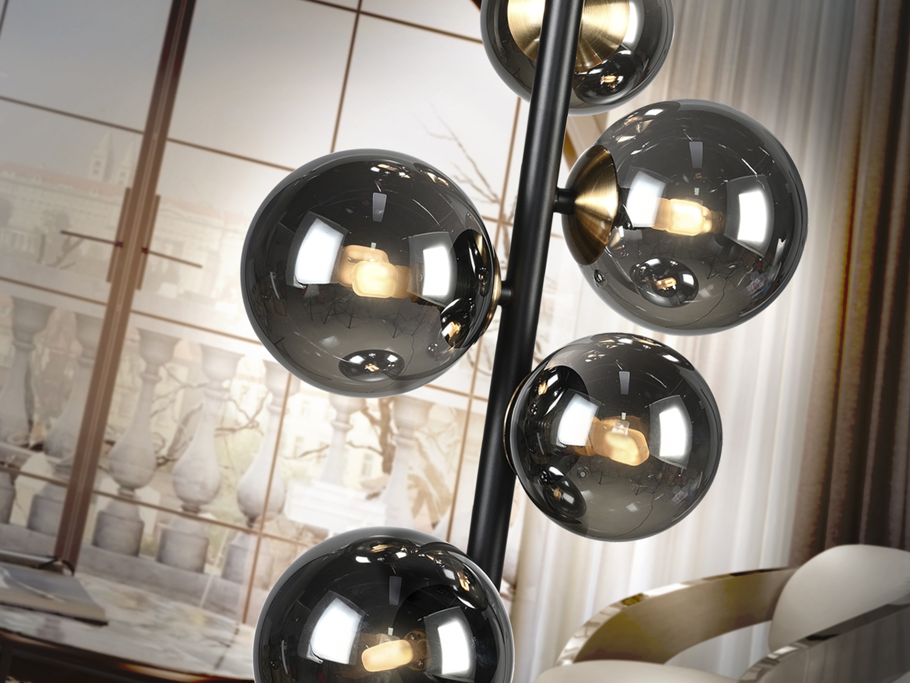 метал в матово черно покритие, полиран месинг, сферични стъклени абажури в блестяща опушена сива тоналност