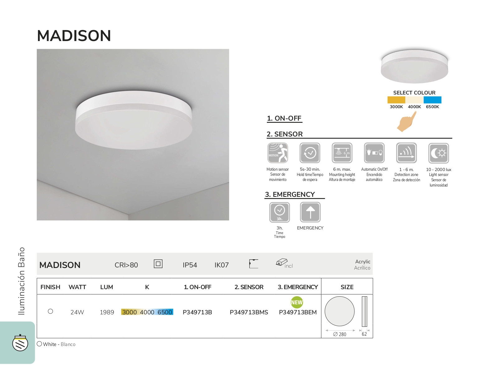 Лед плафон, аплик, външна лампа P349713BMS (3497/28 24W/3000/4000/6500К IP54 White ще осигури комфорт и естетика във всяко помещение, в което се постави. Цялостната визия и дизайн на led лампата и вложените в изработката й материали, като полимер в бял цвят, сензор за движение, сензор за осветеност 10-2000lux, време на светене след включване на сензора 5s - 30min, висока устойчивост на удар IK07, промяна на цветната температура 3000K/4000К/6500K, ще допринесат за един неповторим стил. Благодарение на дългогодишния опит в производството на лед осветление, качествените материали и строгия контрол на качеството на изработка на производителя ACB (Испания), P349713BMS (3497/28 24W/3000/4000/6500К IP54 White е на високо европейско ниво.