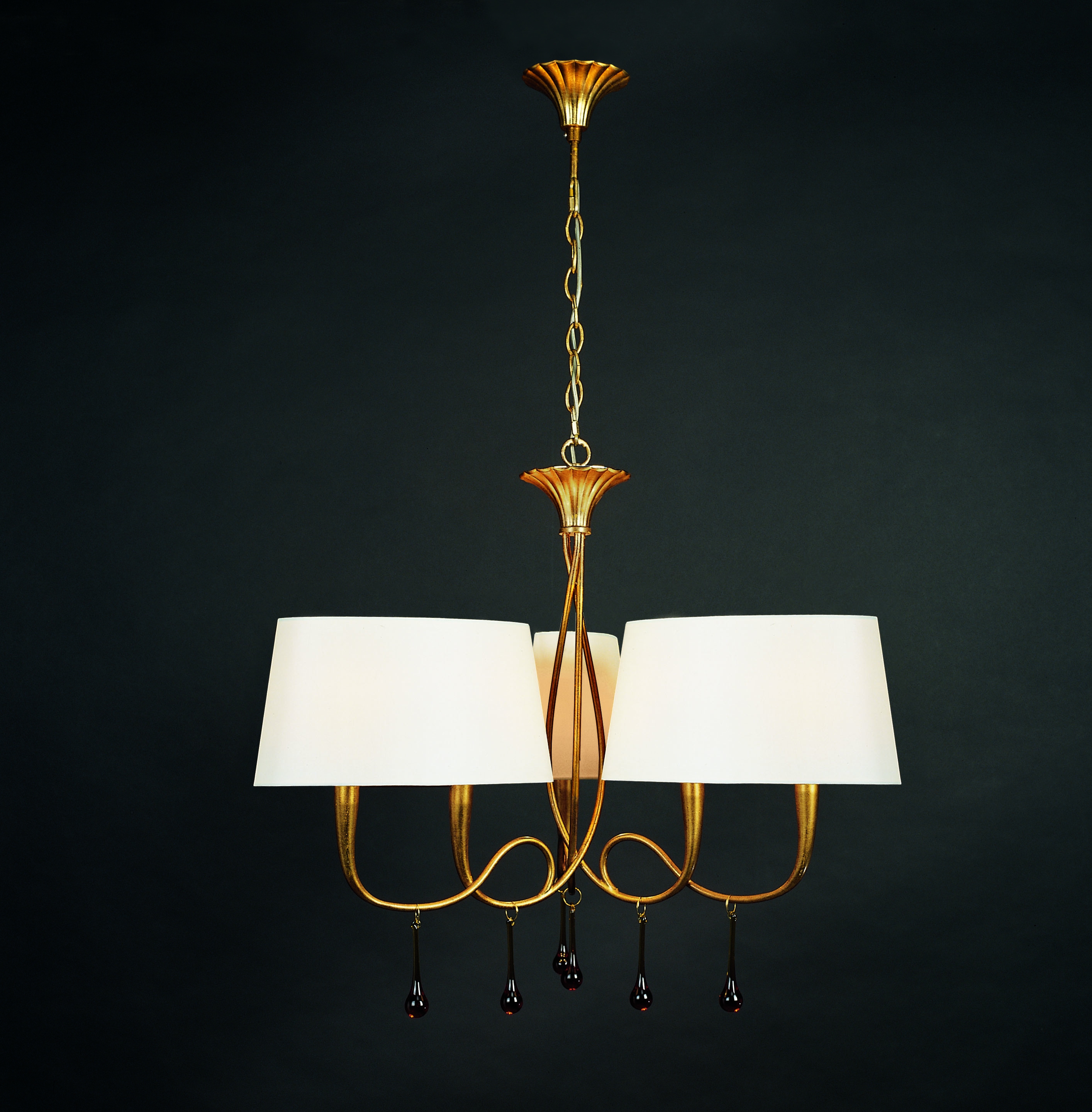 метал в цвят антично злато, висулки от стъкло в цвят коняк, абажури от текстил в цвят крем