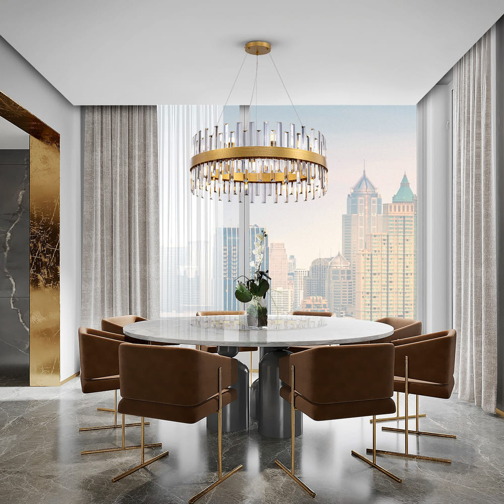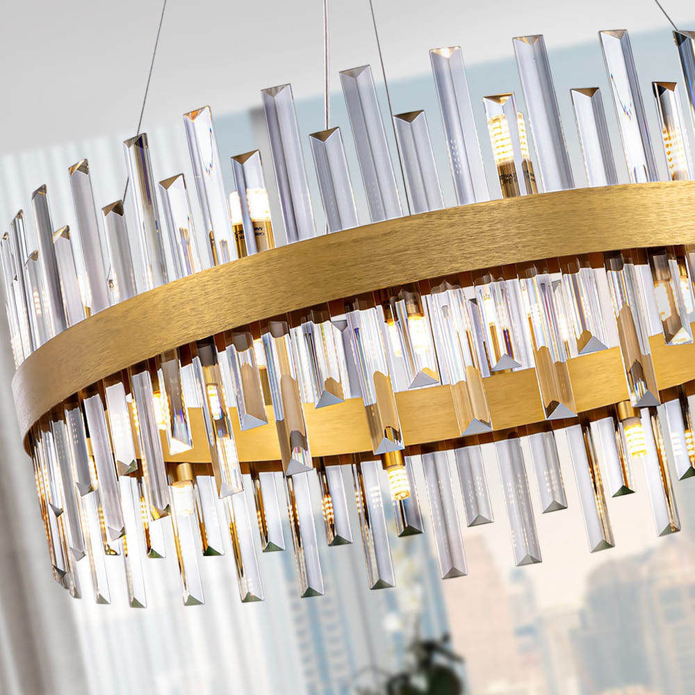 За стила и естетиката на интериора допринасят, както цялостната визия и дизайн на осветителното тяло, така и вложените от производителя в изработката висококачествени материали, като матиран метал със златно покритие, дифузьор от прозрачни стъклени призми.
