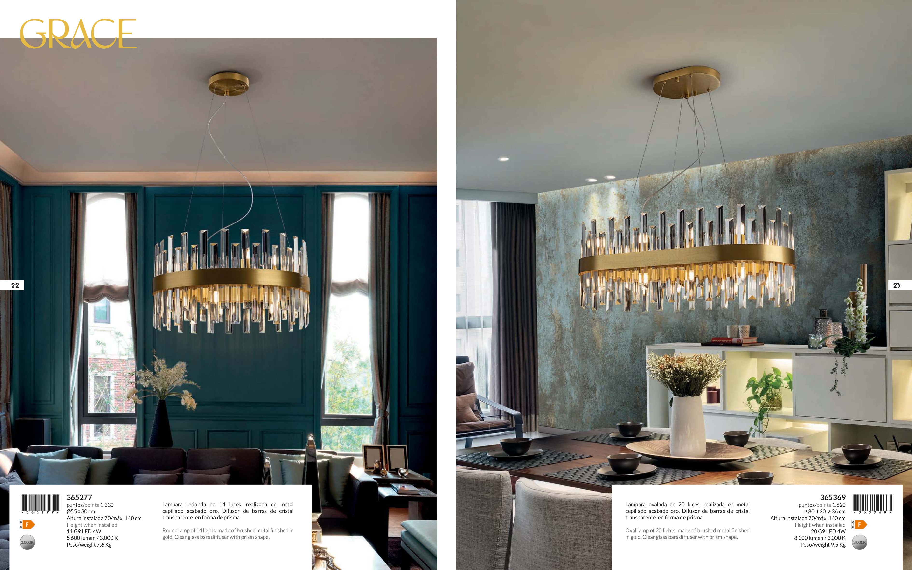 Осветителното тяло 365277 GRACE LAMP, 14L., GOLDEN ще осигури комфорт и естетика във всяко помещение, в което се постави. Цялостната визия и дизайн на лампата и вложените в изработката й материали, като матиран метал със златно покритие, дифузьор от прозрачни стъклени призми, ще допринесат за един неповторим стил. Благодарение на дългогодишния опит, качествените материали и строгия контрол на качеството на изработка на производителя Schuller (Испания), 365277 GRACE LAMP, 14L., GOLDEN е на високо европейско ниво.