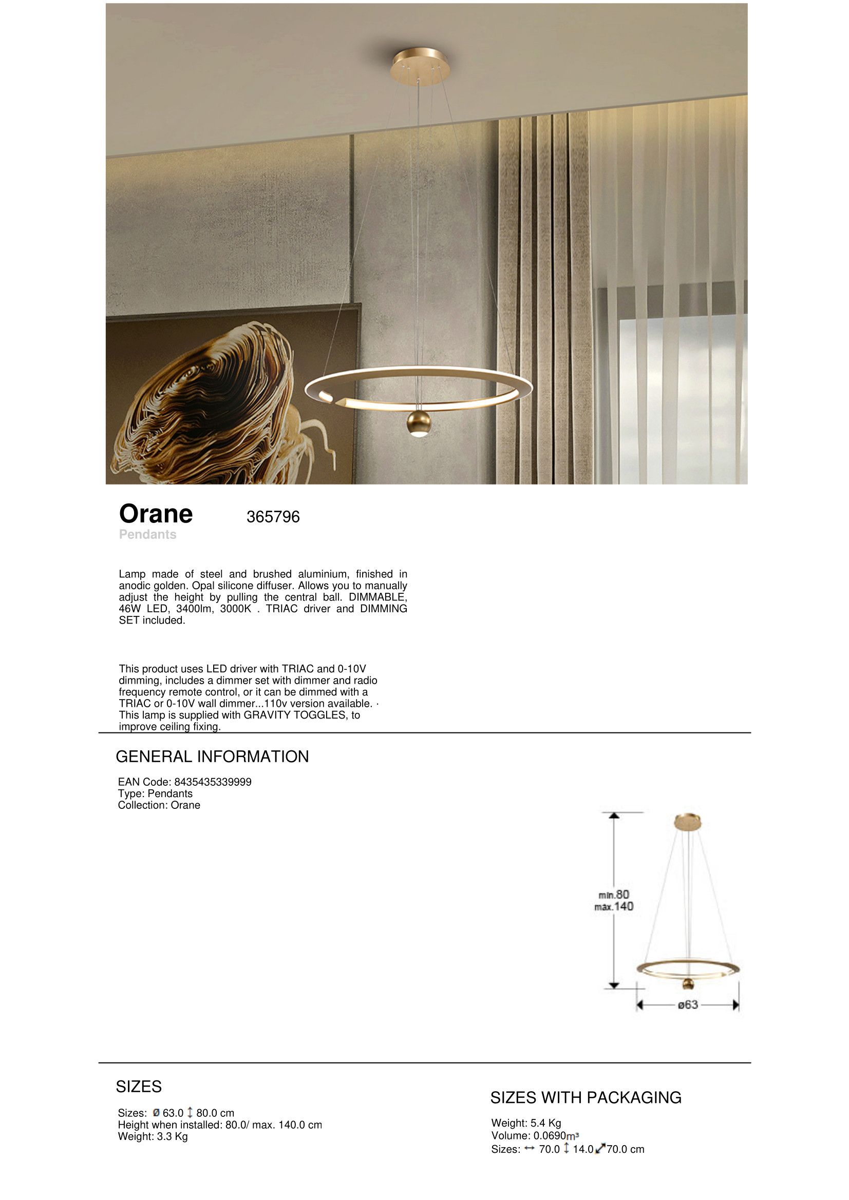 Осветителното тяло 365796 ORANE - GOLDEN LAMP D60 представлява полилей в съвременен, дизайнерски стил. 365796 ORANE - GOLDEN LAMP D60 е от категорията осветителни тела и е подходящо за осветяване на различни помещения и пространства като: всекидневна / хол, спалня, кухня, трапезария, офис.