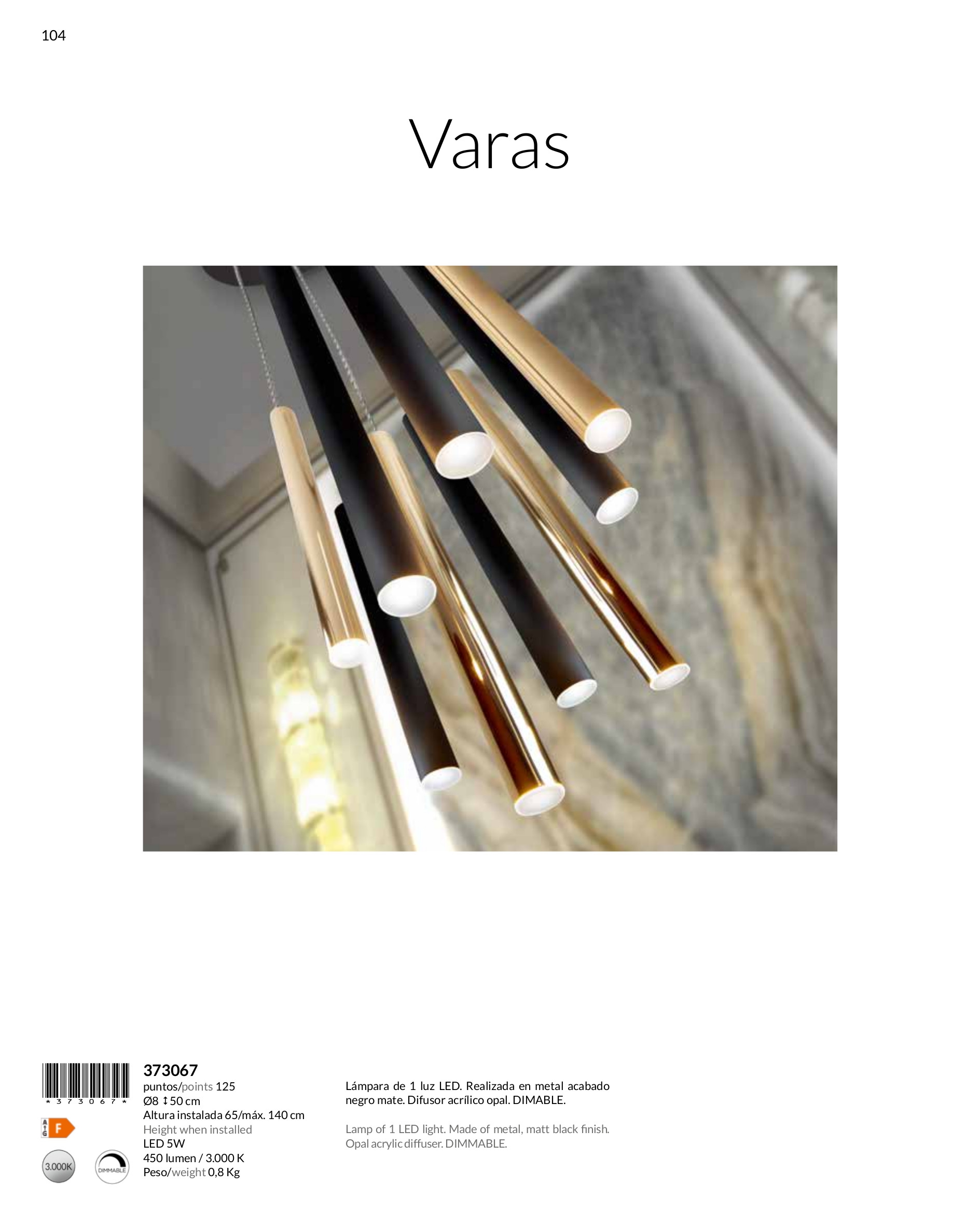 Осветителното тяло 373067 VARAS ще осигури комфорт и естетика във всяко помещение, в което се постави. Цялостната визия и дизайн на лампата и вложените в изработката й материали, като метал в цвят черен мат, дифузер от полимер в цвят опалово бяло, ще допринесат за един неповторим стил. Благодарение на дългогодишния опит, качествените материали и строгия контрол на качеството на изработка на производителя Schuller (Испания), 373067 VARAS е на високо европейско ниво.