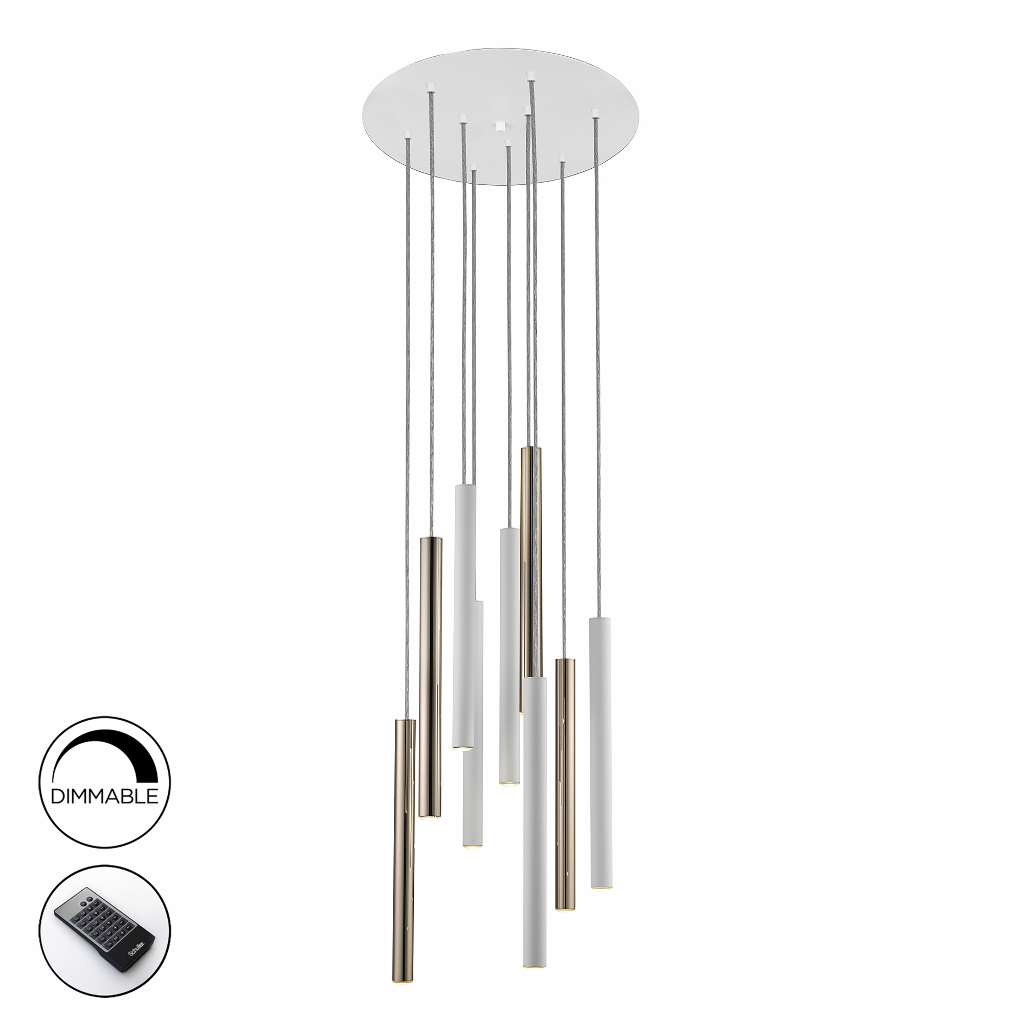 Лед полилей 373250D VARAS LAMP GOLD/WHITE 9L DIMMABLE ще осигури комфорт и естетика във всяко помещение, в което се постави. Цялостната визия и дизайн на led лампата и вложените в изработката й материали, като метал в цвят лъскаво злато, метал в матово бял цвят, дифузьор от опалово бял полимер, включено дистанционно управление в комплекта, ще допринесат за един неповторим стил. Благодарение на дългогодишния опит в производството на лед осветление, качествените материали и строгия контрол на качеството на изработка на производителя Schuller (Испания), 373250D VARAS LAMP GOLD/WHITE 9L DIMMABLE е на високо европейско ниво.
