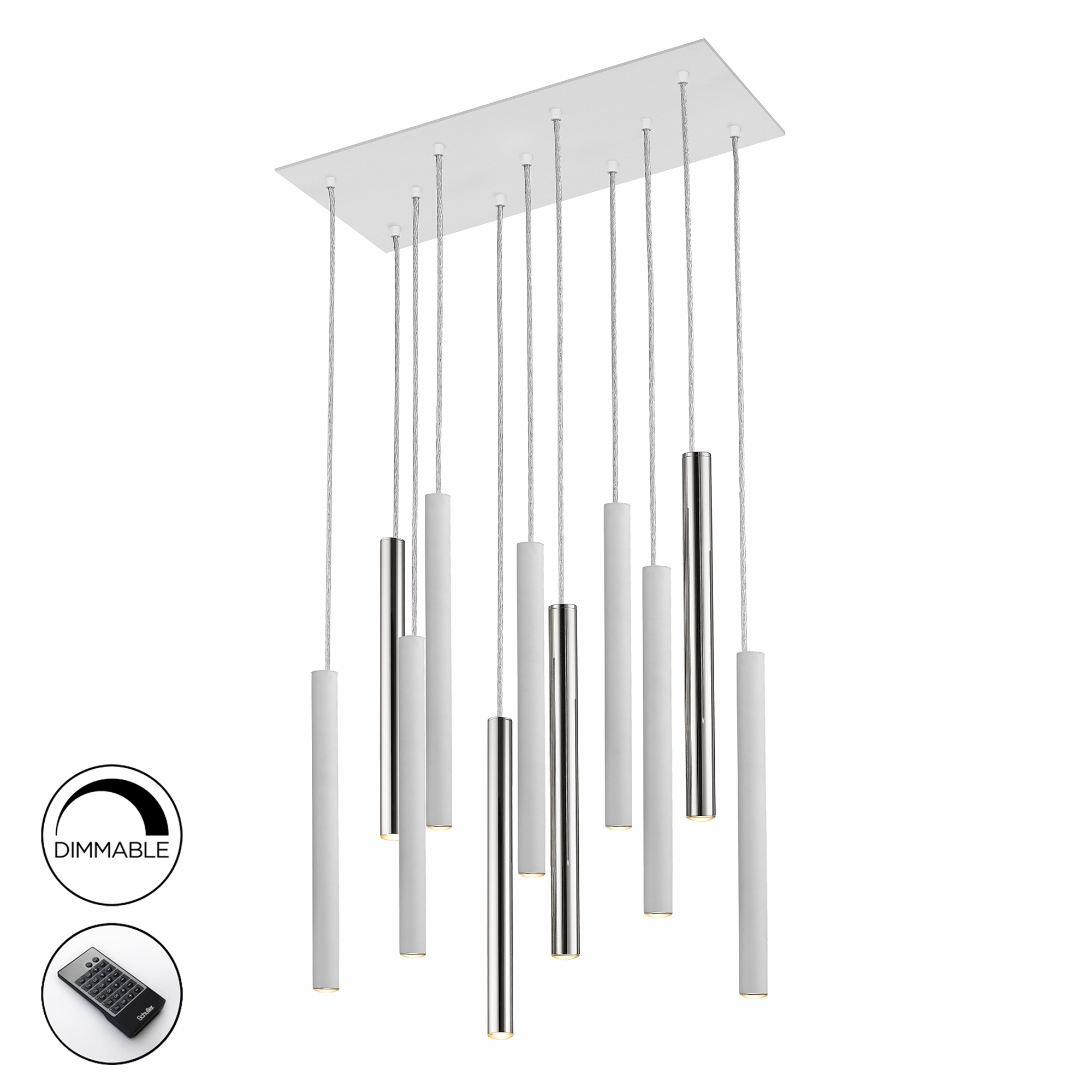 Лед полилей 373378D VARAS LAMP CHROME/WHITE 11L. DIMMABLE ще осигури комфорт и естетика във всяко помещение, в което се постави. Цялостната визия и дизайн на led лампата и вложените в изработката й материали, като хромиран метал, метал с матово бяло покритие, дифузьор от опалово бял полимер, включено дистанционно управление към комплекта, ще допринесат за един неповторим стил. Благодарение на дългогодишния опит в производството на лед осветление, качествените материали и строгия контрол на качеството на изработка на производителя Schuller (Испания), 373378D VARAS LAMP CHROME/WHITE 11L. DIMMABLE е на високо европейско ниво.