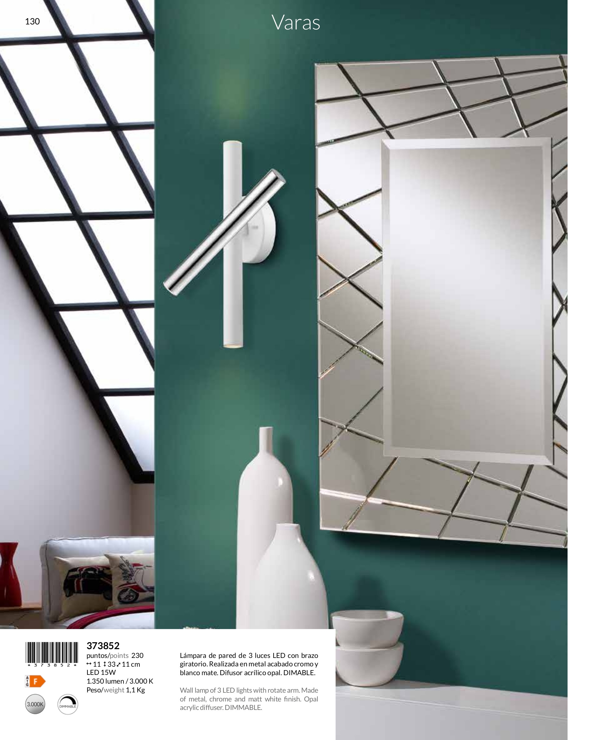 Осветителното тяло 373852 VARAS WALL LAMP CHROME/WHITE 3L. ще осигури комфорт и естетика във всяко помещение, в което се постави. Цялостната визия и дизайн на лампата и вложените в изработката й материали, като хромиран метал, метал с матово бяло покритие, дифузьор от опалово бял полимер, ще допринесат за един неповторим стил. Благодарение на дългогодишния опит, качествените материали и строгия контрол на качеството на изработка на производителя Schuller (Испания), 373852 VARAS WALL LAMP CHROME/WHITE 3L. е на високо европейско ниво.