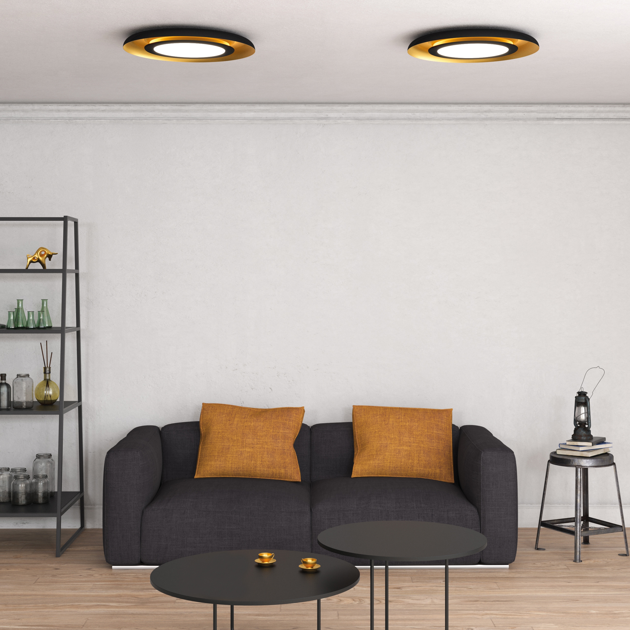 Осветителното тяло P374060NO (3740/55 60W/3200K Black/Gold Ceiling) представлява плафон в съвременен стил. P374060NO (3740/55 60W/3200K Black/Gold Ceiling) е от категорията осветителни тела и е подходящо за осветяване на различни помещения и пространства като: всекидневна / хол, спалня, кухня, трапезария, коридор, антре, стълбище, офис.