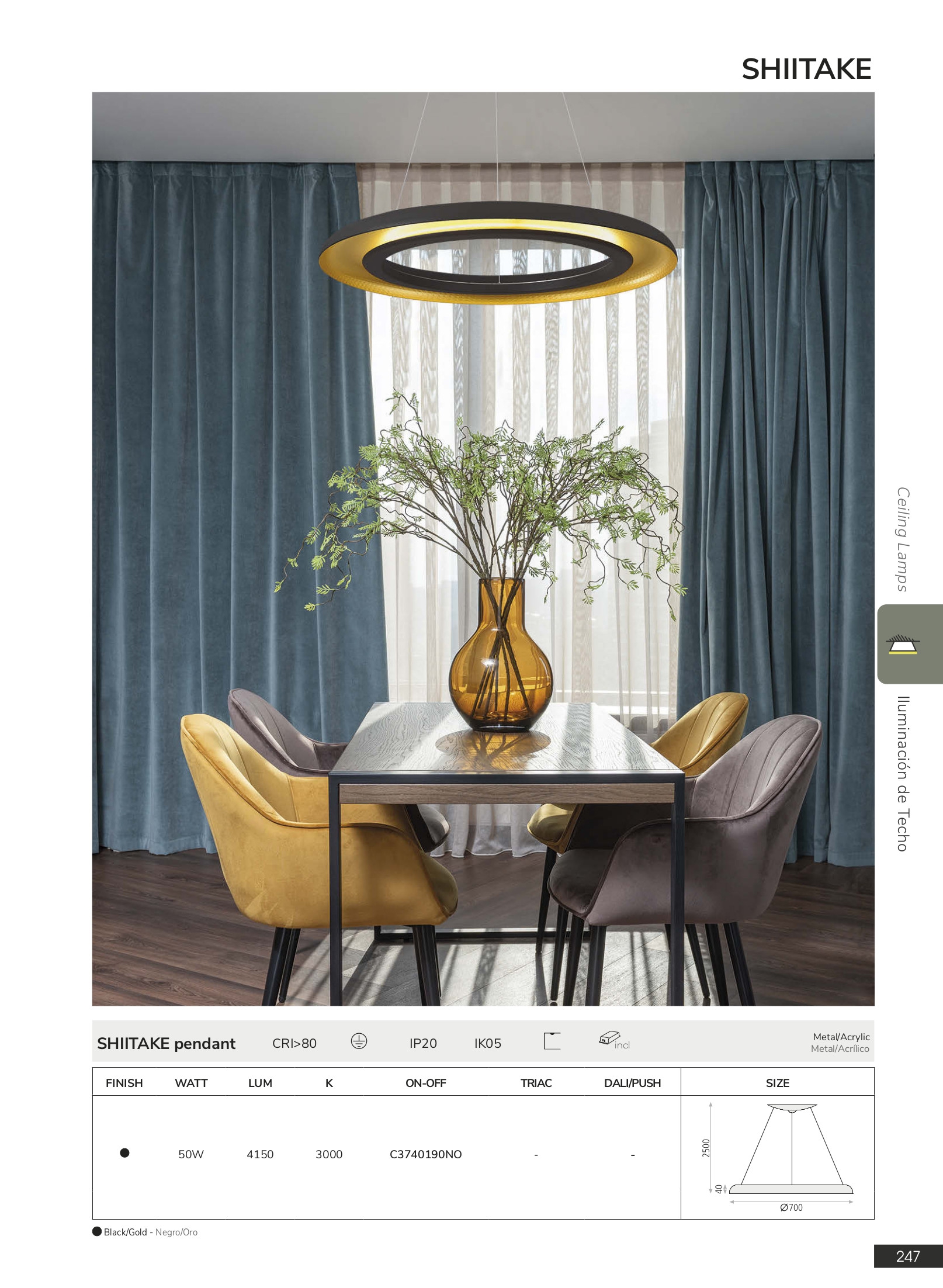 Осветителното тяло C3740190NO (3740/70 60W/3200K Black/Gold Pendant) представлява полилей в съвременен стил. C3740190NO (3740/70 60W/3200K Black/Gold Pendant) е от категорията осветителни тела и е подходящо за осветяване на различни помещения и пространства като: всекидневна / хол, спалня, кухня, трапезария, офис.