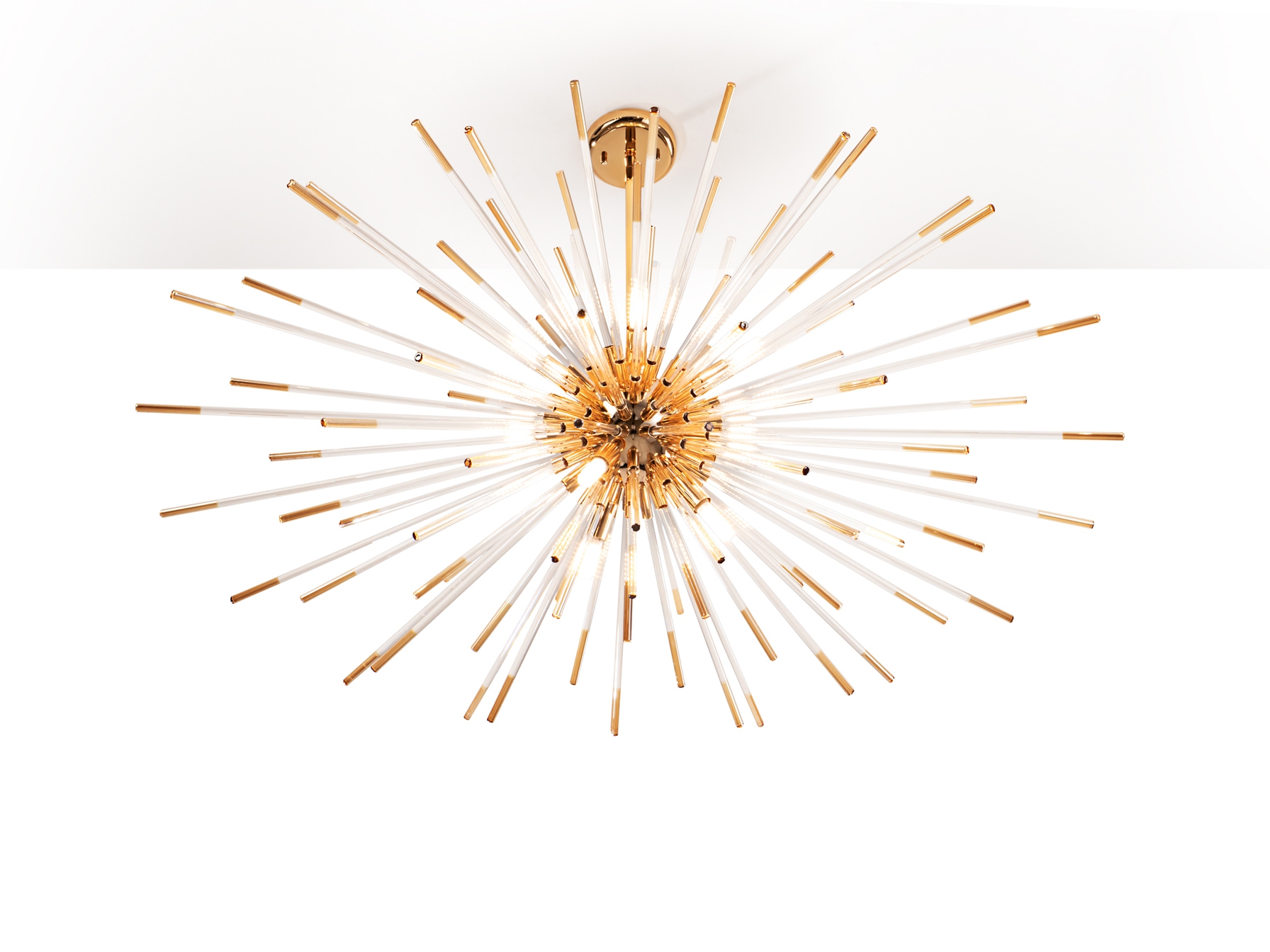 метал в цвят лъскаво цлато, радиални пръти от прозрачно стъкло с краища, декорирани в покритие с цвят злато, включено дистанционно управление