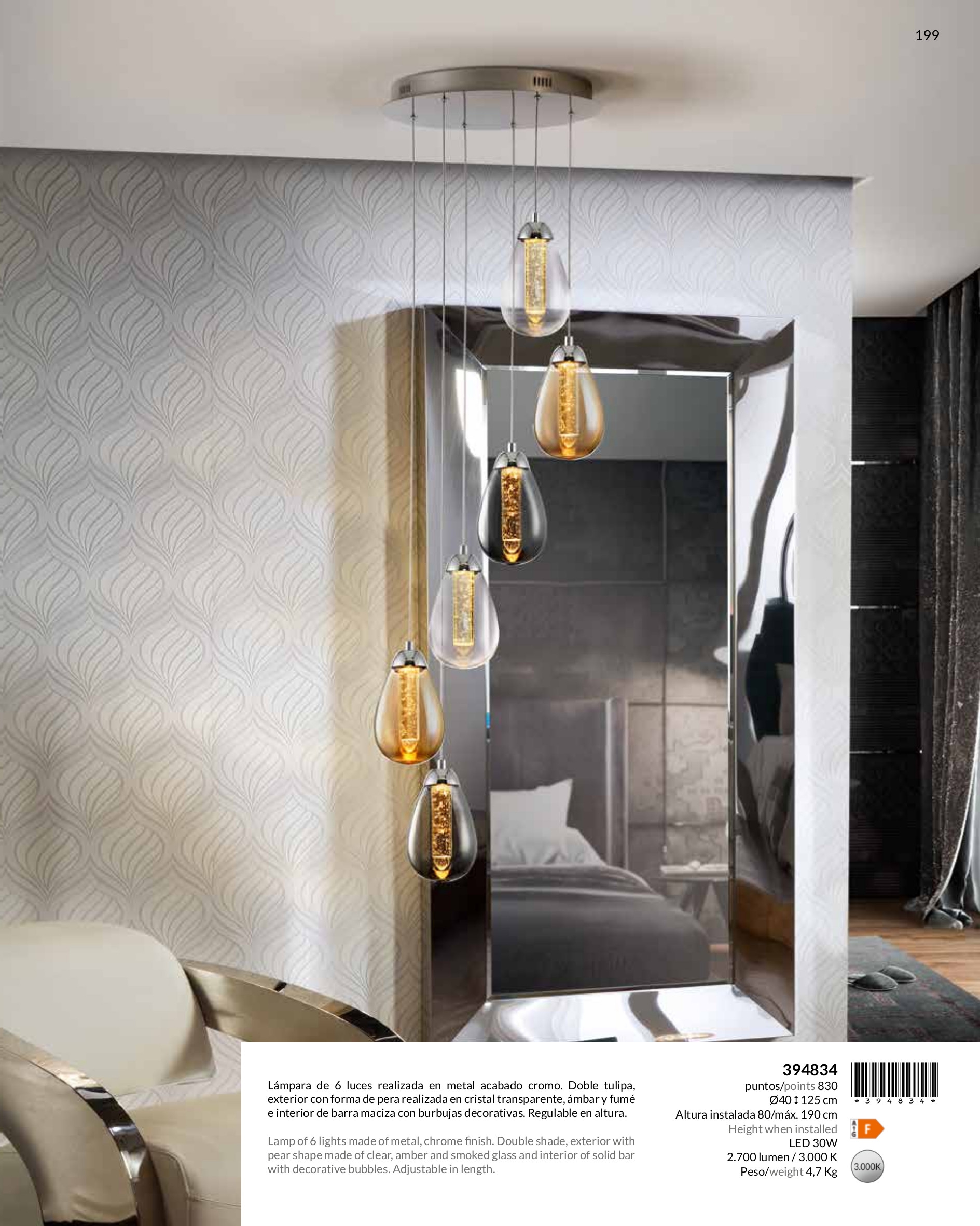 Осветителното тяло 394834 TACCIA LAMP 6L,CHROME/COLOUR ще осигури комфорт и естетика във всяко помещение, в което се постави. Цялостната визия и дизайн на лампата и вложените в изработката й материали, като хромиран метал, двоен абажур, външен с крушовидна форма от прозрачно или кехлибарено или опушено стъкло и вътрешен от масивен прозрачен стъклен цилиндър с балончета, прозрачен кабел, ще допринесат за един неповторим стил. Благодарение на дългогодишния опит, качествените материали и строгия контрол на качеството на изработка на производителя Schuller (Испания), 394834 TACCIA LAMP 6L,CHROME/COLOUR е на високо европейско ниво.
