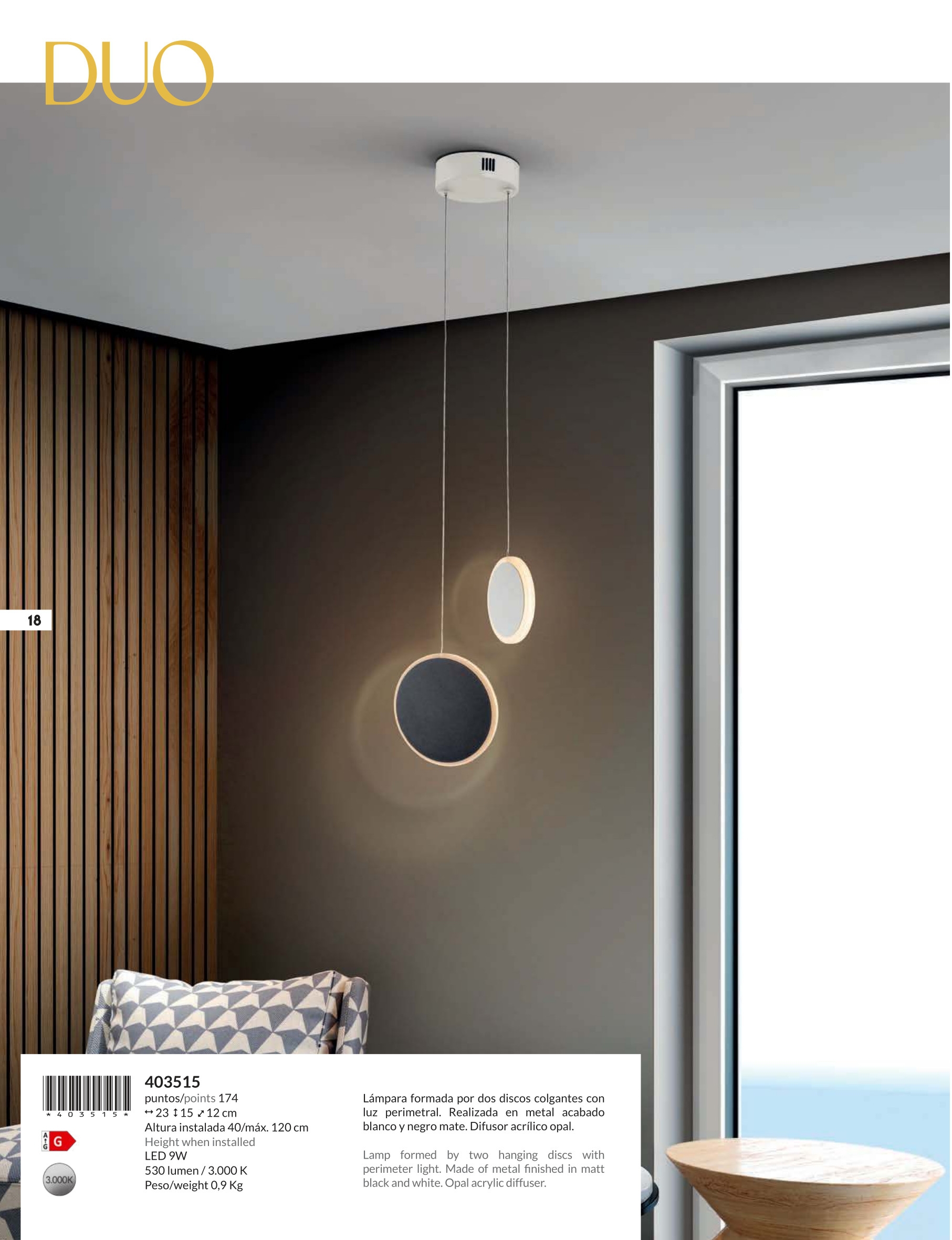 Осветителното тяло 403515 DUO - LAMP 2L WHITE-BLACK ще осигури комфорт и естетика във всяко помещение, в което се постави. Цялостната визия и дизайн на лампата и вложените в изработката й материали, като метал в бяло и черно, дифузер от опалово бял акрил, ще допринесат за един неповторим стил. Благодарение на дългогодишния опит, качествените материали и строгия контрол на качеството на изработка на производителя Schuller (Испания), 403515 DUO - LAMP 2L WHITE-BLACK е на високо европейско ниво.