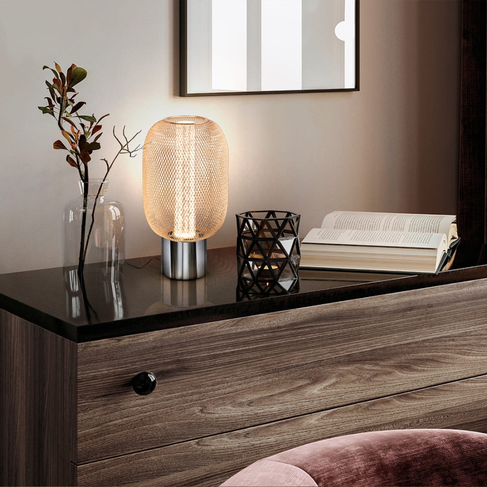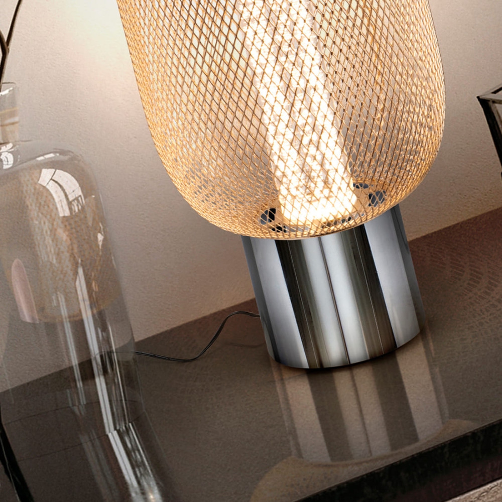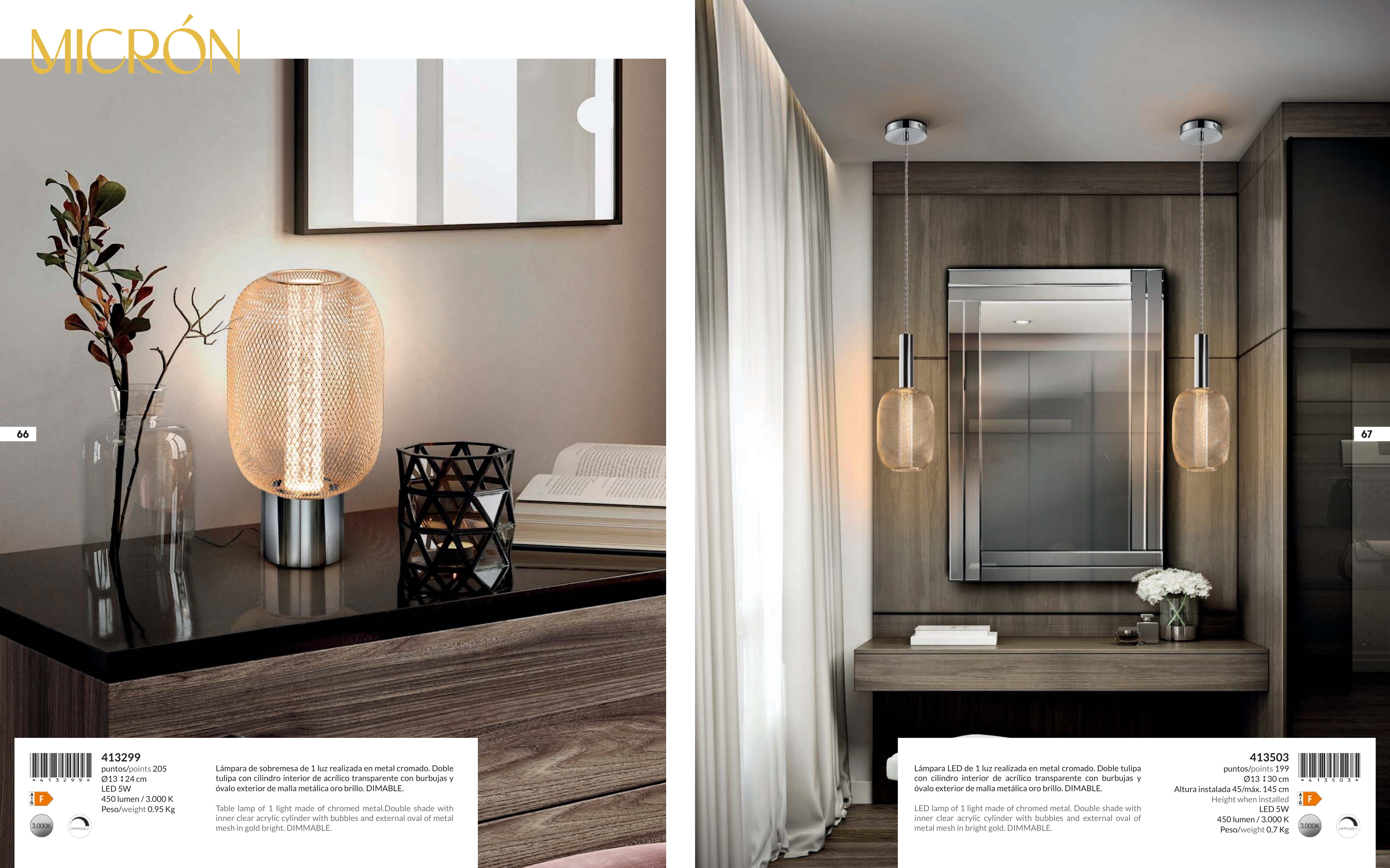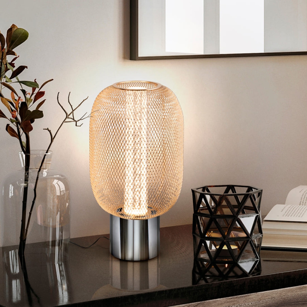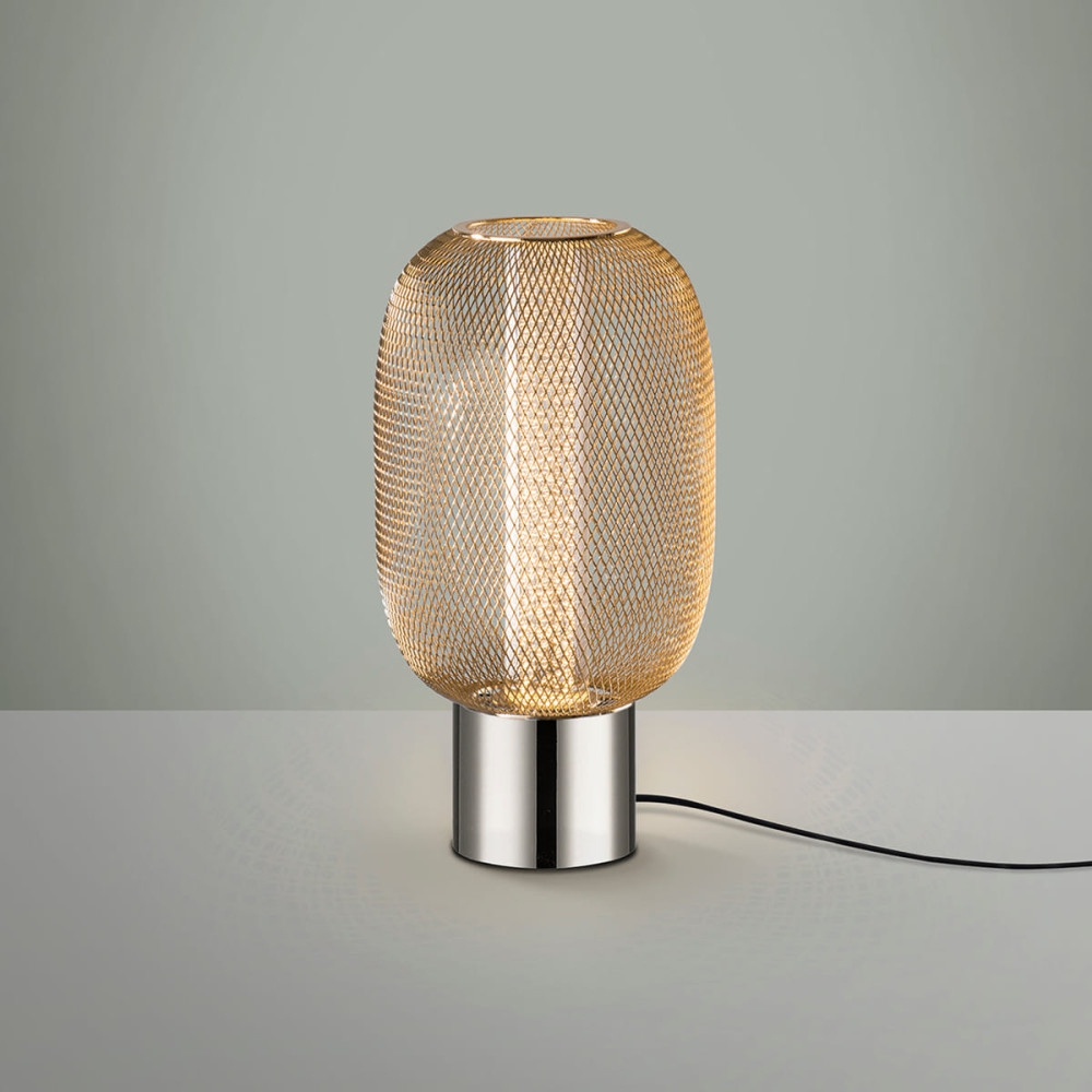 Осветителното тяло 413299 ·MICRON· TABLE LAMP, 1L., CHROME/GOLD ще осигури комфорт и естетика във всяко помещение, в което се постави. Цялостната визия и дизайн на лампата и вложените в изработката й материали, като метал в цвят хром, двоен абажур - вътрешен цилиндър от прозрачен акрил с мехурчета и външен овал от черна метална мрежа, ще допринесат за един неповторим стил. Благодарение на дългогодишния опит, качествените материали и строгия контрол на качеството на изработка на производителя Schuller (Испания), 413299 ·MICRON· TABLE LAMP, 1L., CHROME/GOLD е на високо европейско ниво.