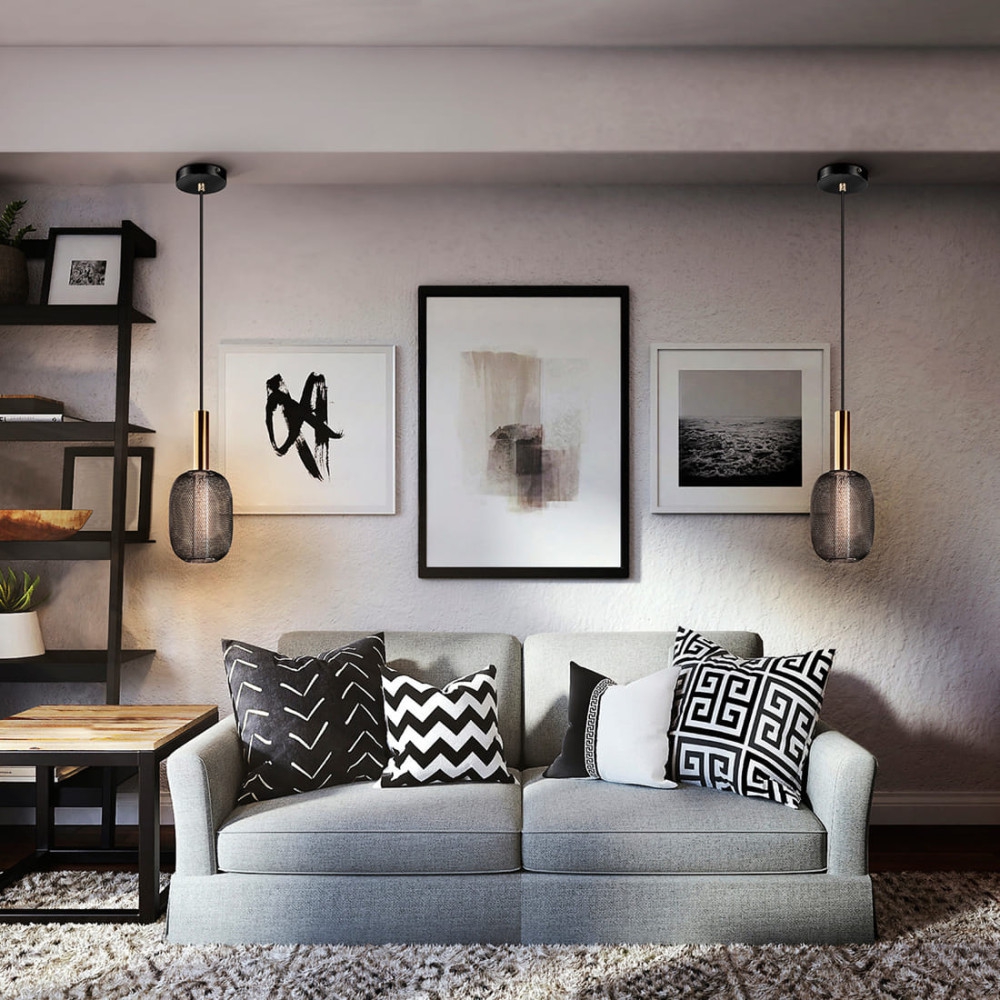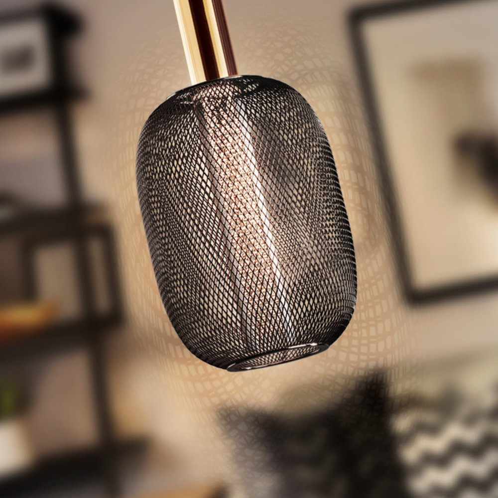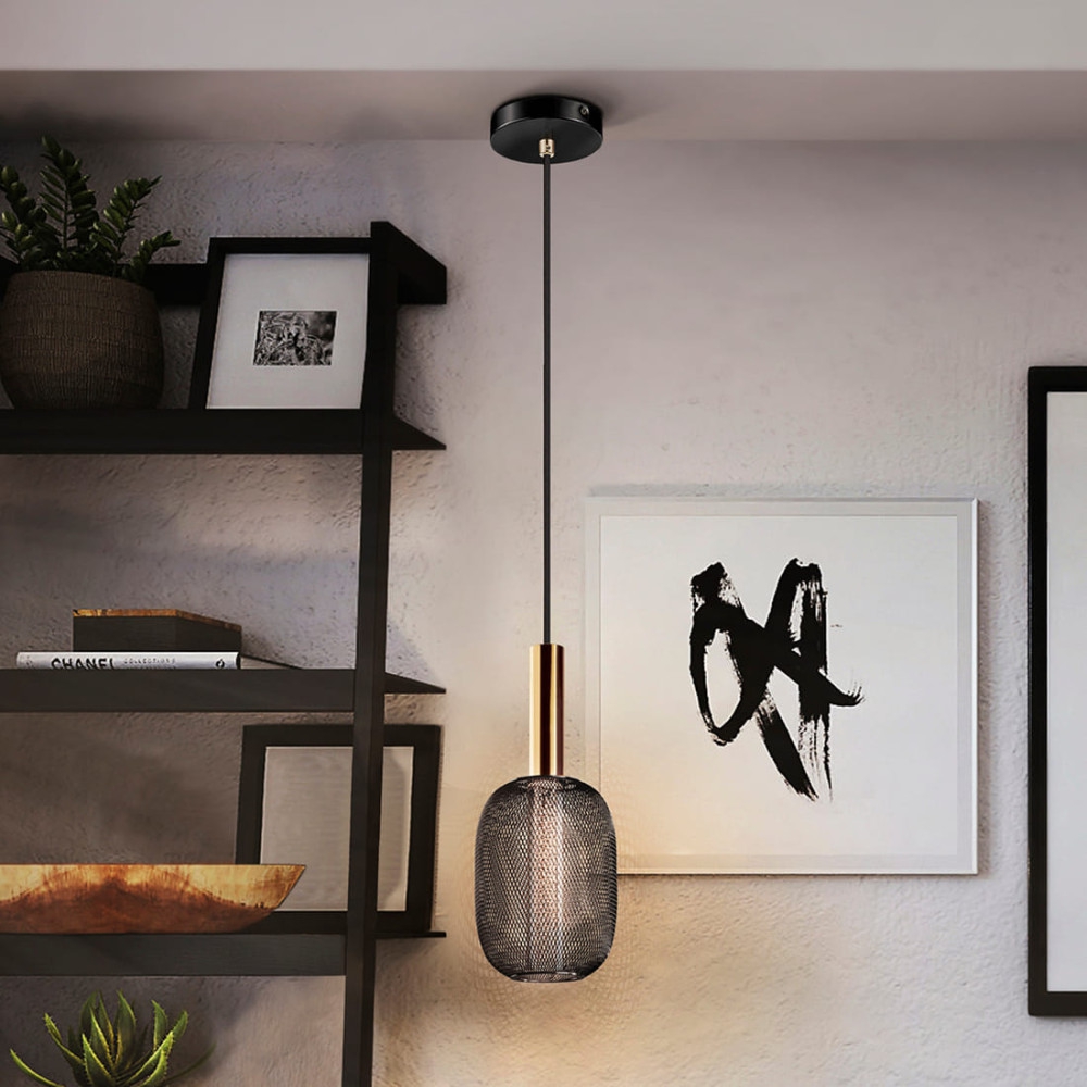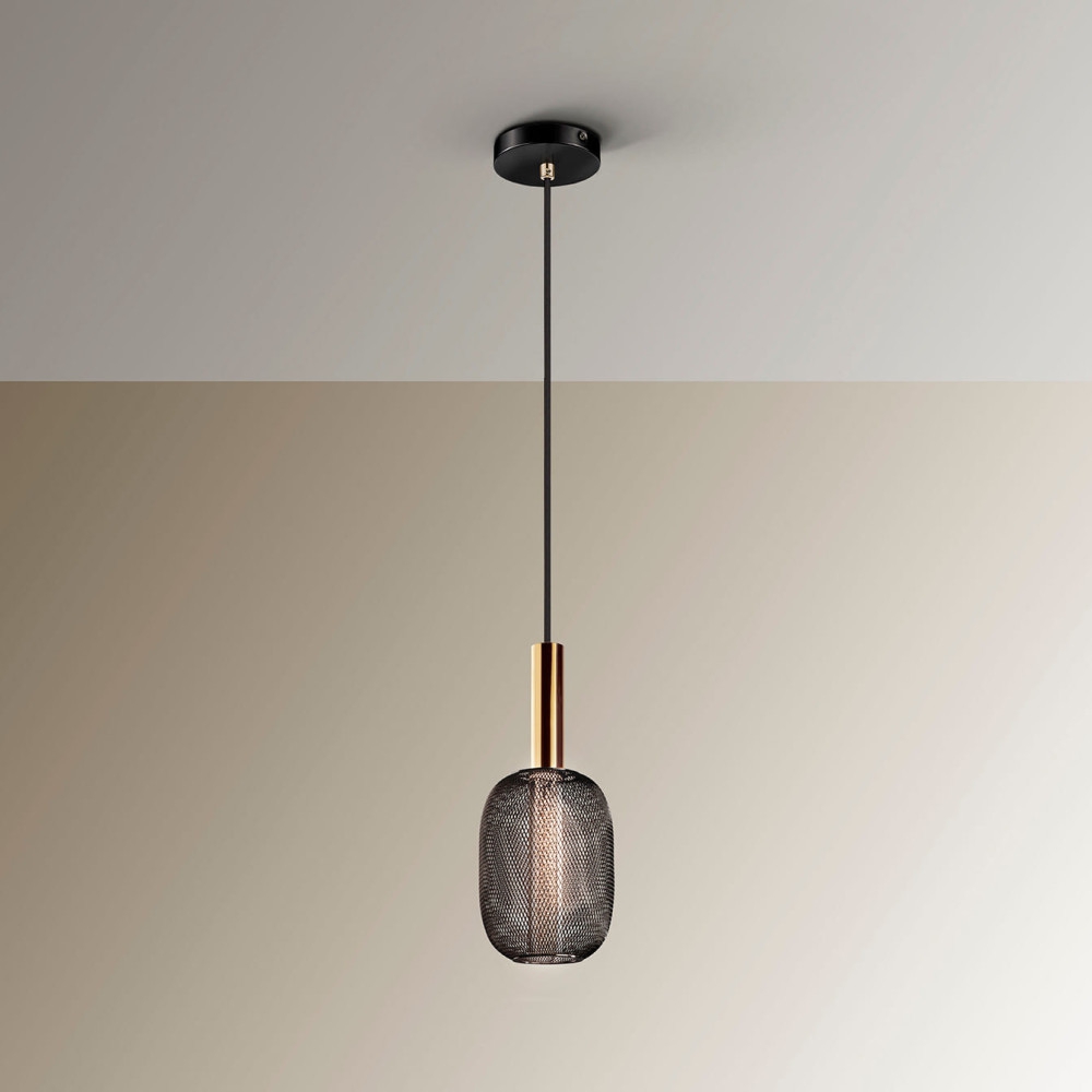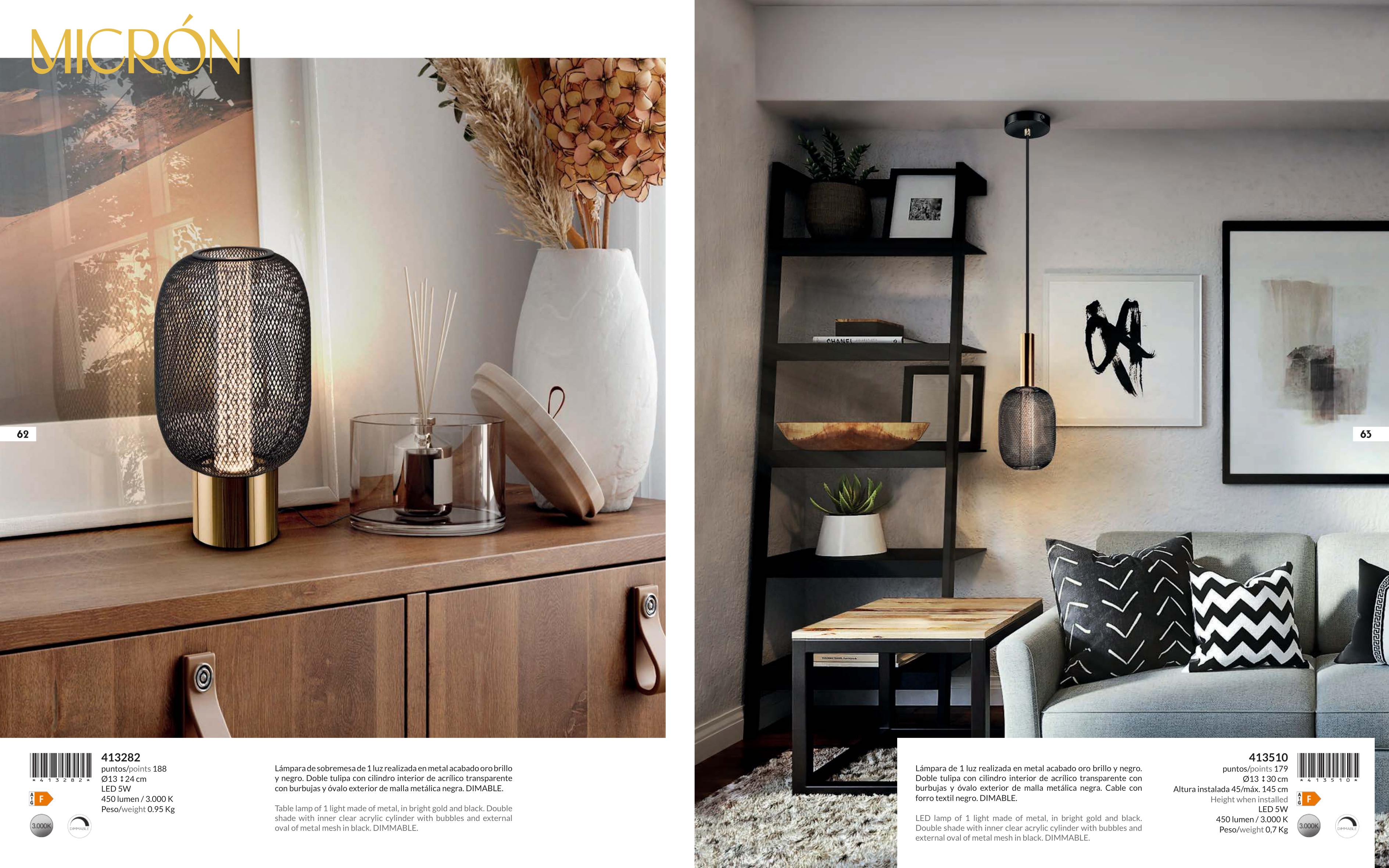 Осветителното тяло 413510 ·MICRON· LAMP, 1L., GOLD/BLACK ще осигури комфорт и естетика във всяко помещение, в което се постави. Цялостната визия и дизайн на лампата и вложените в изработката й материали, като метал в черен цвят, декоративни елементи в цвят злато, двоен абажур - вътрешен цилиндър от прозрачен акрил с мехурчета и външен овал от черна метална мрежа, ще допринесат за един неповторим стил. Благодарение на дългогодишния опит, качествените материали и строгия контрол на качеството на изработка на производителя Schuller (Испания), 413510 ·MICRON· LAMP, 1L., GOLD/BLACK е на високо европейско ниво.