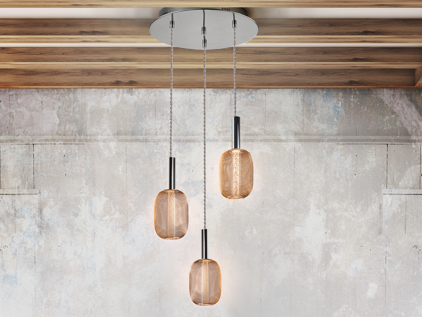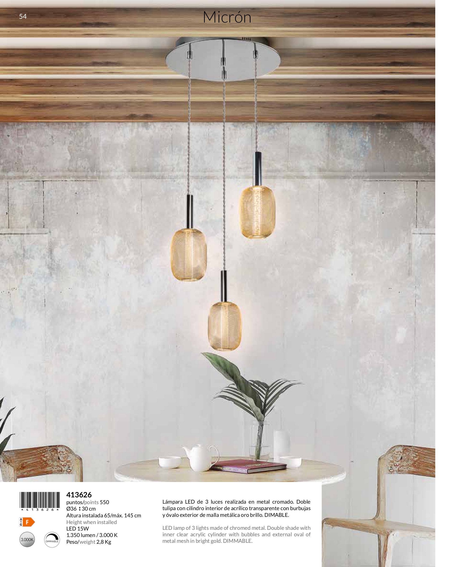 Осветителното тяло 413626 MICRON LAMP 3L., CHROME/GOLD ще осигури комфорт и естетика във всяко помещение, в което се постави. Цялостната визия и дизайн на лампата и вложените в изработката й материали, като хромиран метал, двоен абажур с вътрешен прозрачен акрилен цилиндър с мехурчета и външен овал от метална мрежа в цвят ярко златисто, ще допринесат за един неповторим стил. Благодарение на дългогодишния опит, качествените материали и строгия контрол на качеството на изработка на производителя Schuller (Испания), 413626 MICRON LAMP 3L., CHROME/GOLD е на високо европейско ниво.