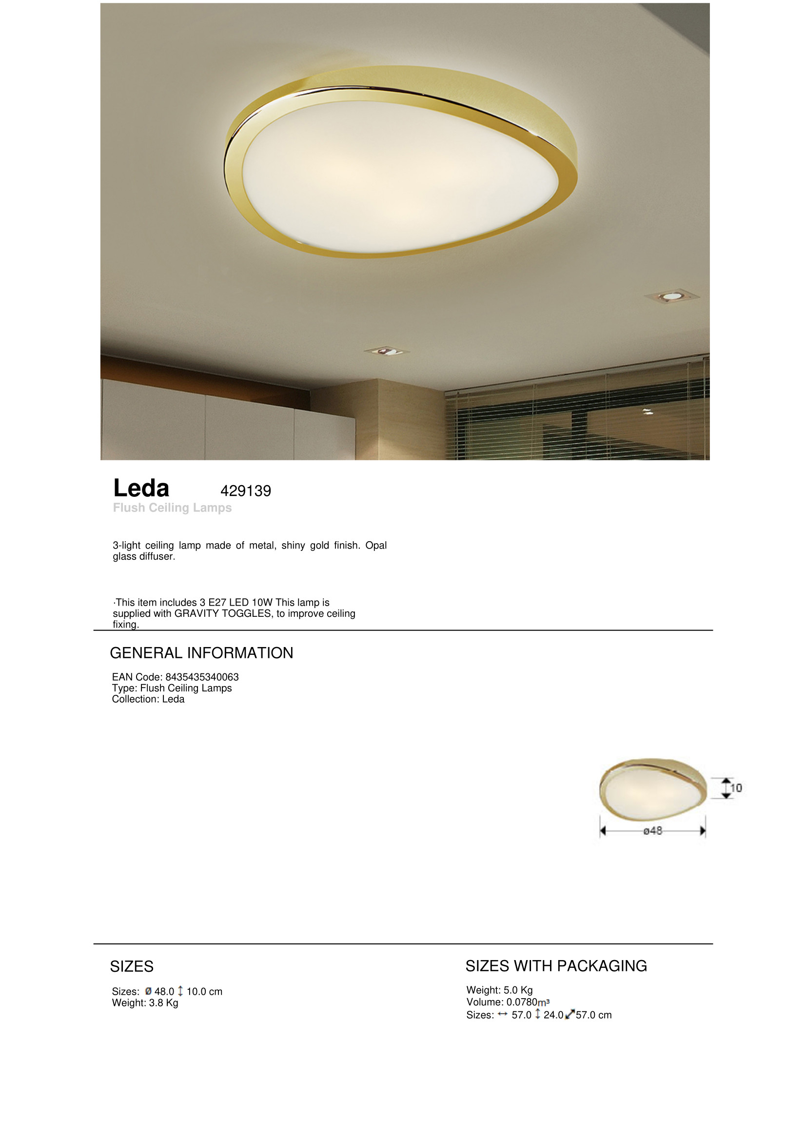 Осветителното тяло 429139 LEDA- CEILING LAMP 3L - GOLD представлява лед плафон в съвременен стил. 429139 LEDA- CEILING LAMP 3L - GOLD е от категорията и е подходящо за осветяване на различни помещения и пространства като: всекидневна / хол, спалня, кухня, трапезария, коридор, антре, стълбище, офис.