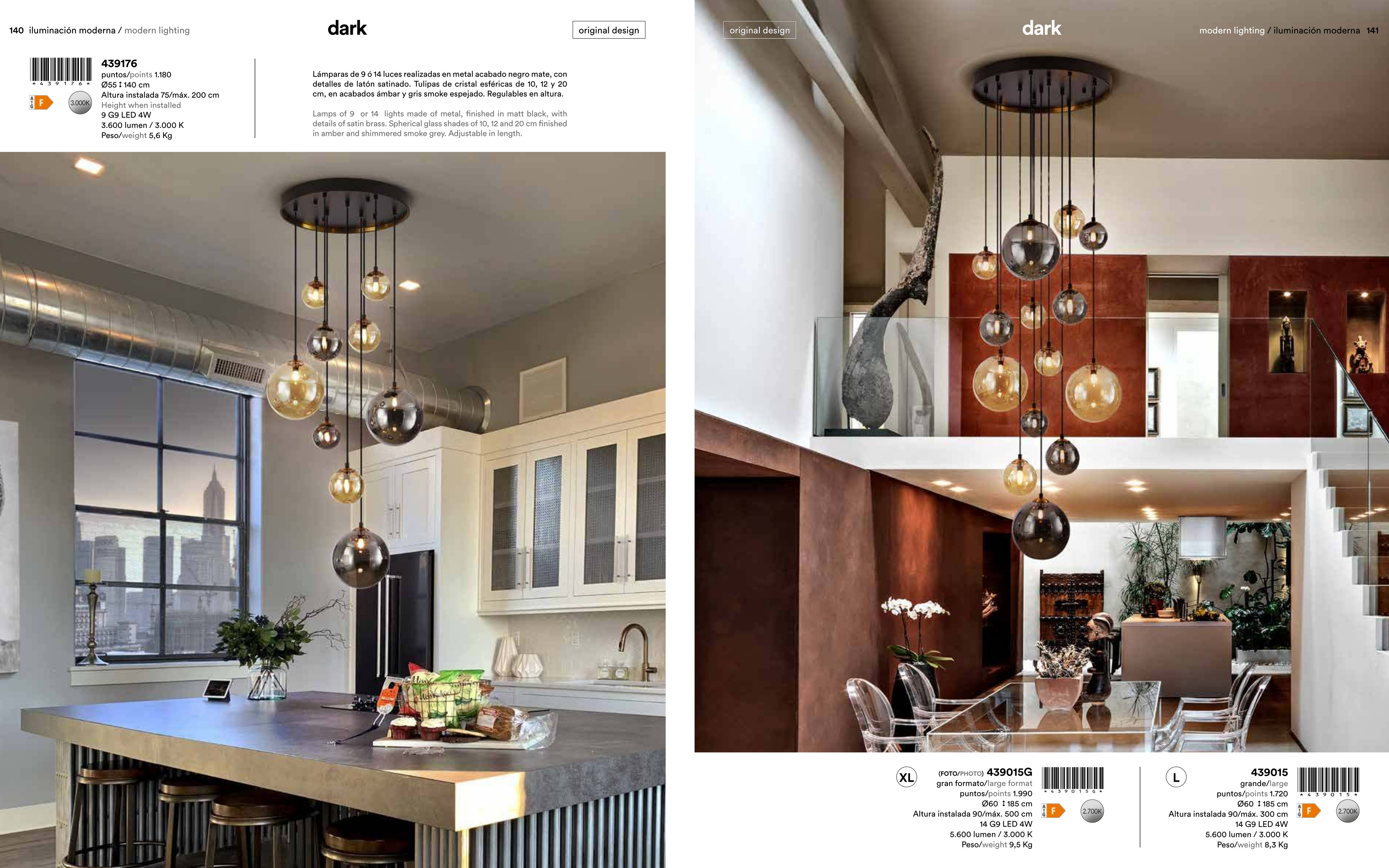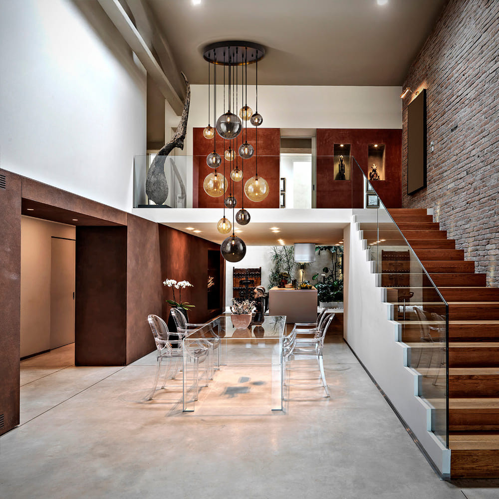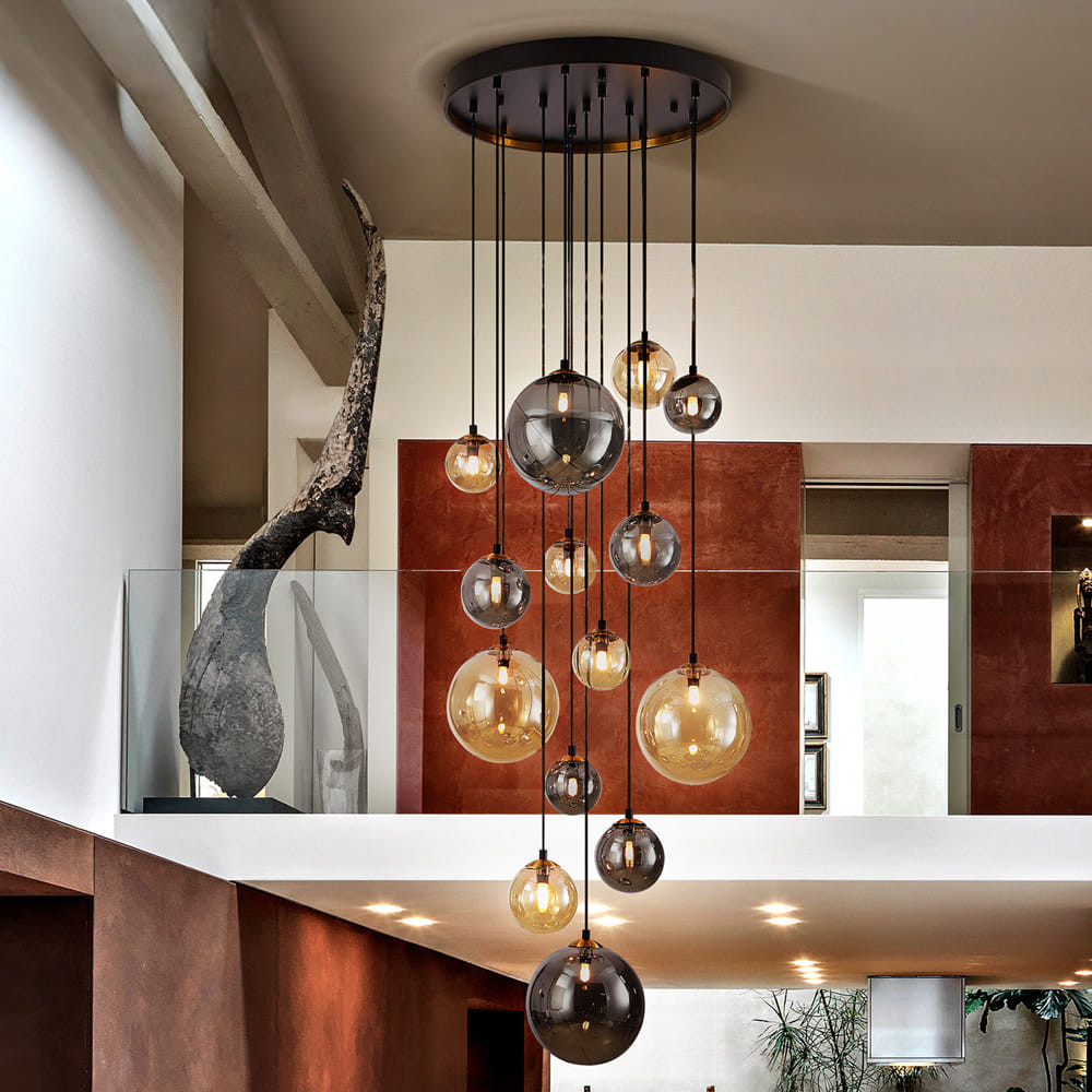 За стила и естетиката на интериора допринасят, както цялостната визия и дизайн на осветителното тяло, така и вложените от производителя в изработката висококачествени материали, като метал в матово черен цвят, детайли от сатениран месинг, сферични стъклени абажури в кехлибарено или блестящо опушено сиво.