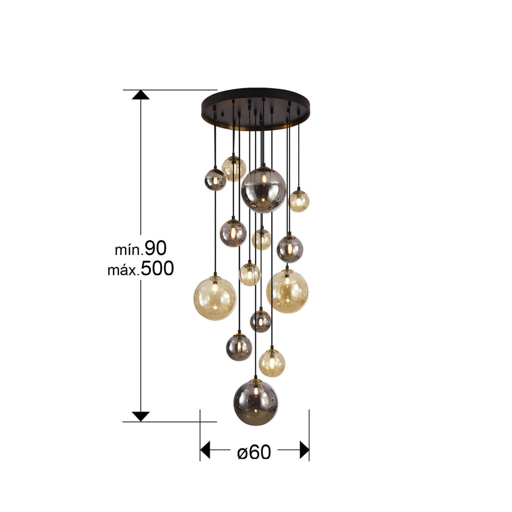 метал в матово черен цвят, детайли от сатениран месинг, сферични стъклени абажури в кехлибарено или блестящо опушено сиво