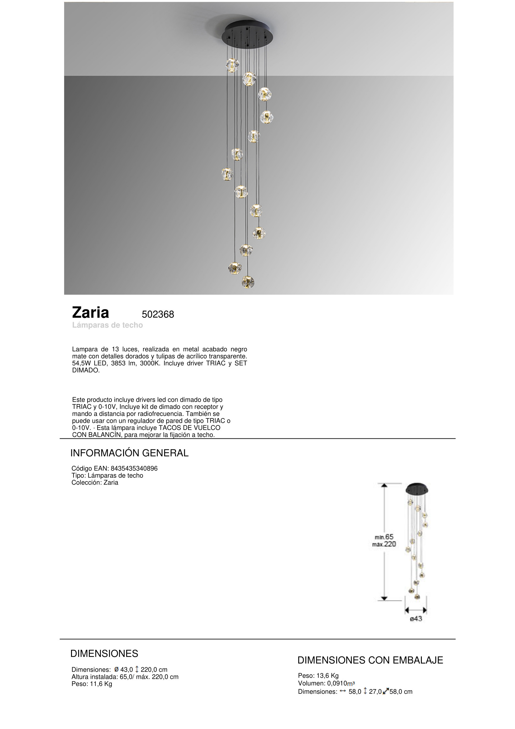Осветителното тяло 502368 ZARIA- LAMP 13L nero/oro/transp d60 dimmable ще осигури комфорт и естетика във всяко помещение, в което се постави. Цялостната визия и дизайн на лампата и вложените в изработката й материали, като метал с матово черно покритие, златни детайли, прозрачни акрилни абажури, включва комплект за димиране, ще допринесат за един неповторим стил. Благодарение на дългогодишния опит, качествените материали и строгия контрол на качеството на изработка на производителя Schuller (Испания), 502368 ZARIA- LAMP 13L nero/oro/transp d60 dimmable е на високо европейско ниво.