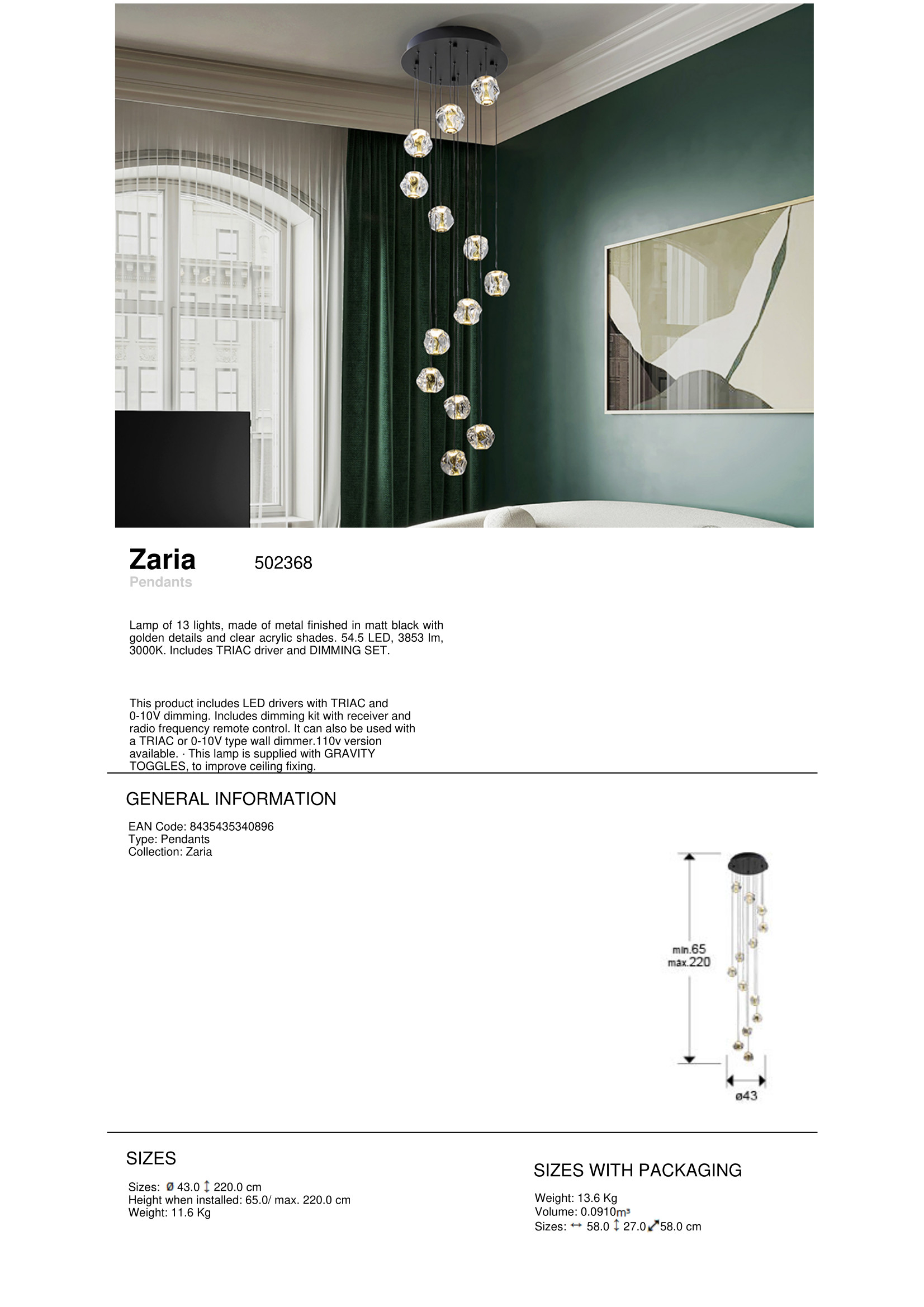 Осветителното тяло 502368 ZARIA-LAMP 13L-BLACK/GOLD/CLEAR D60 DIMMABL представлява полилей в съвременен стил. 502368 ZARIA-LAMP 13L-BLACK/GOLD/CLEAR D60 DIMMABL е от категорията осветителни тела и е подходящо за осветяване на различни помещения и пространства като: всекидневна / хол, спалня, кухня, трапезария, офис.