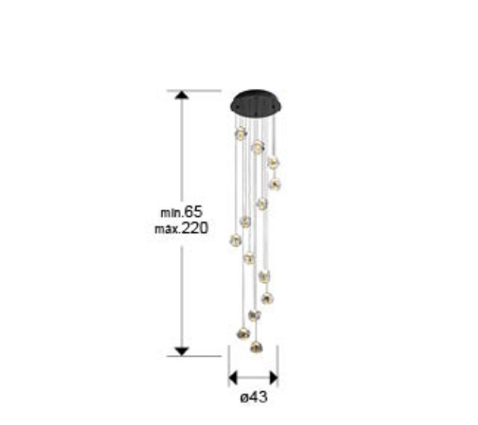Осветителното тяло 502368 ZARIA-LAMP 13L-BLACK/GOLD/CLEAR D60 DIMMABL ще осигури комфорт и естетика във всяко помещение, в което се постави. Цялостната визия и дизайн на лампата и вложените в изработката й материали, като метал с матово черно покритие, златни детайли, прозрачни акрилни абажури, включва комплект за димиране, ще допринесат за един неповторим стил. Благодарение на дългогодишния опит, качествените материали и строгия контрол на качеството на изработка на производителя Schuller (Испания), 502368 ZARIA-LAMP 13L-BLACK/GOLD/CLEAR D60 DIMMABL е на високо европейско ниво.