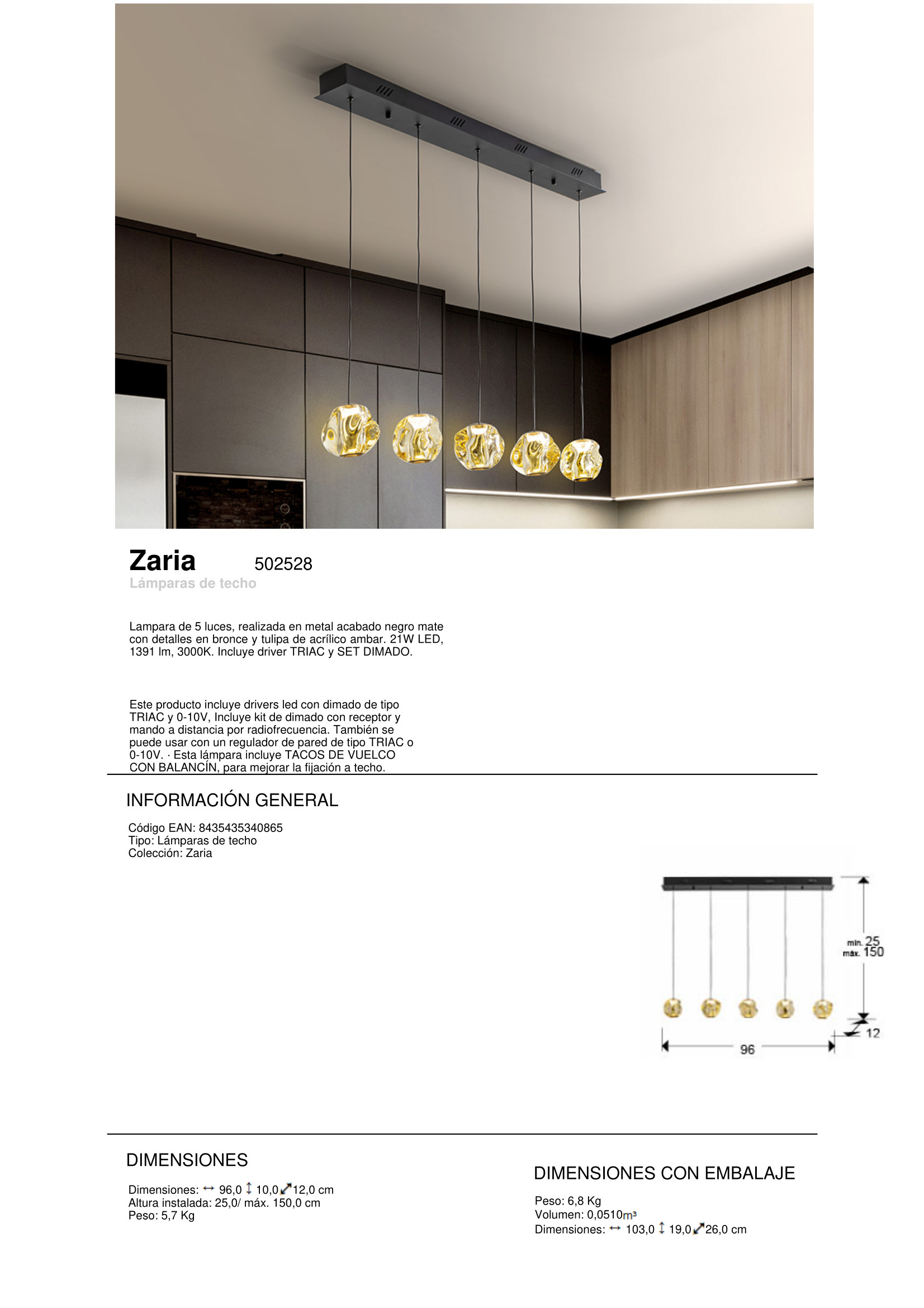 Лед полилей 502528 ZARIA- LAMP 5L- BLACK/BRONZE/AMBER DIMMABLE ще осигури комфорт и естетика във всяко помещение, в което се постави. Цялостната визия и дизайн на led лампата и вложените в изработката й материали, като метал с матово черно покритие, бронзови детайли, кехлибарени акрилни абажури, включва комплект за димиране, ще допринесат за един неповторим стил. Благодарение на дългогодишния опит в производството на лед осветление, качествените материали и строгия контрол на качеството на изработка на производителя Schuller (Испания), 502528 ZARIA- LAMP 5L- BLACK/BRONZE/AMBER DIMMABLE е на високо европейско ниво.
