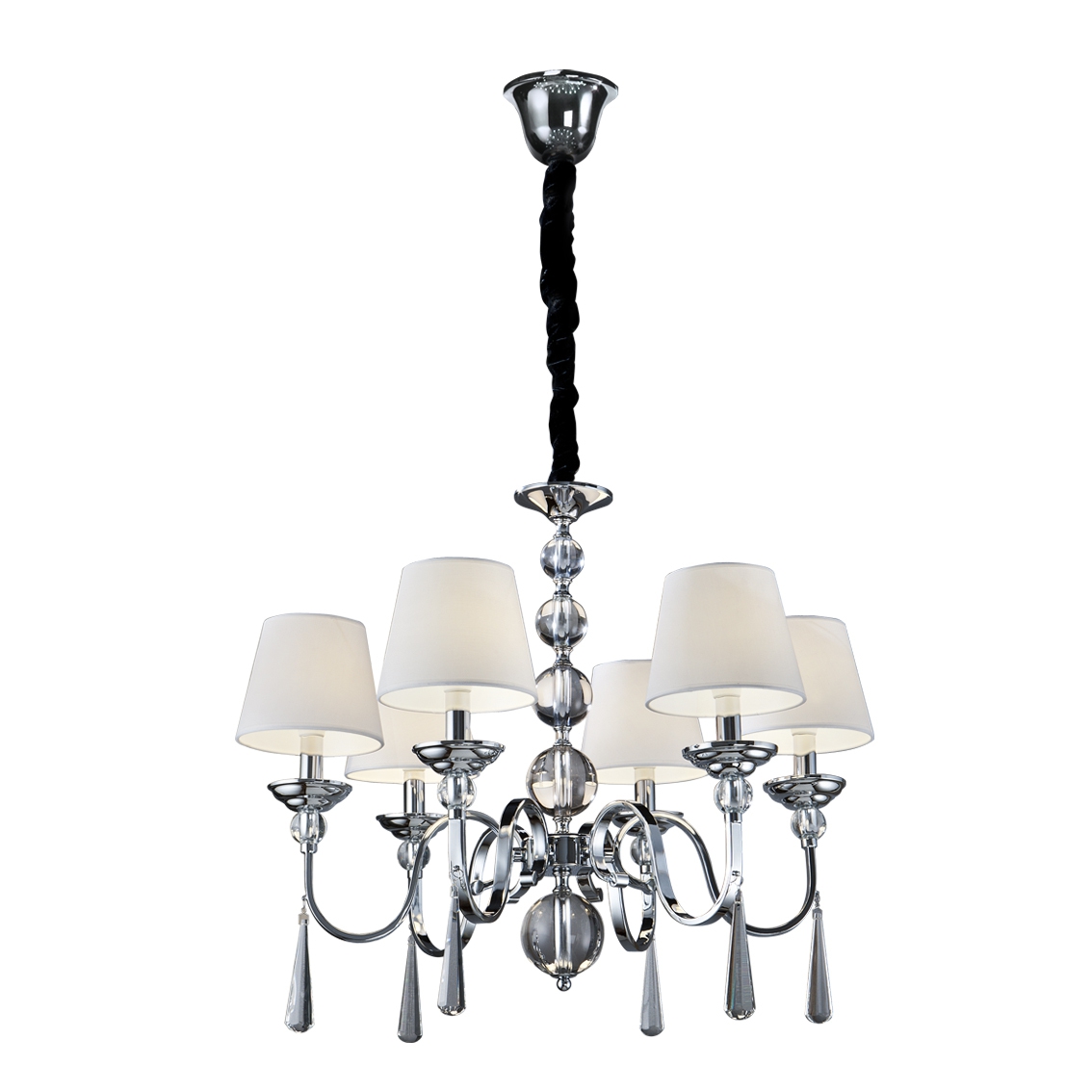 метал с хромирано покритие и кристални топки, фасетирани кристални капки, бял текстилен абажур, черно кадифено покритие за веригата