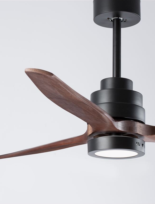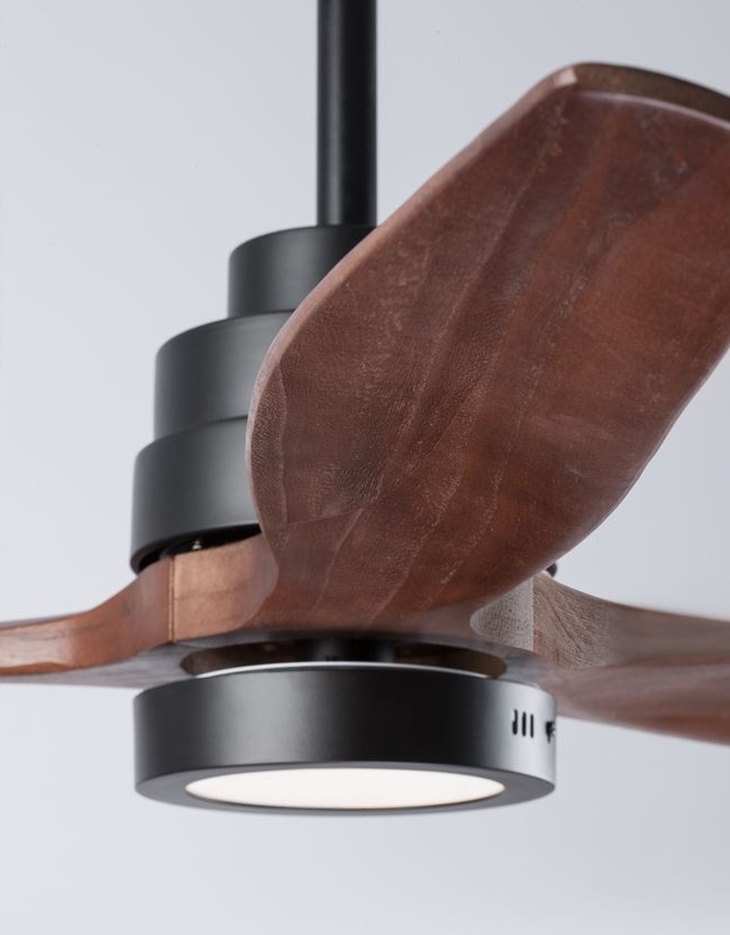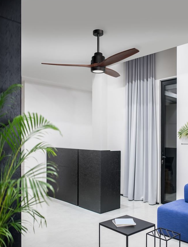 стомана в черен мат, стъкло, перки от тъмно дърво, DC мотор, дистанционно