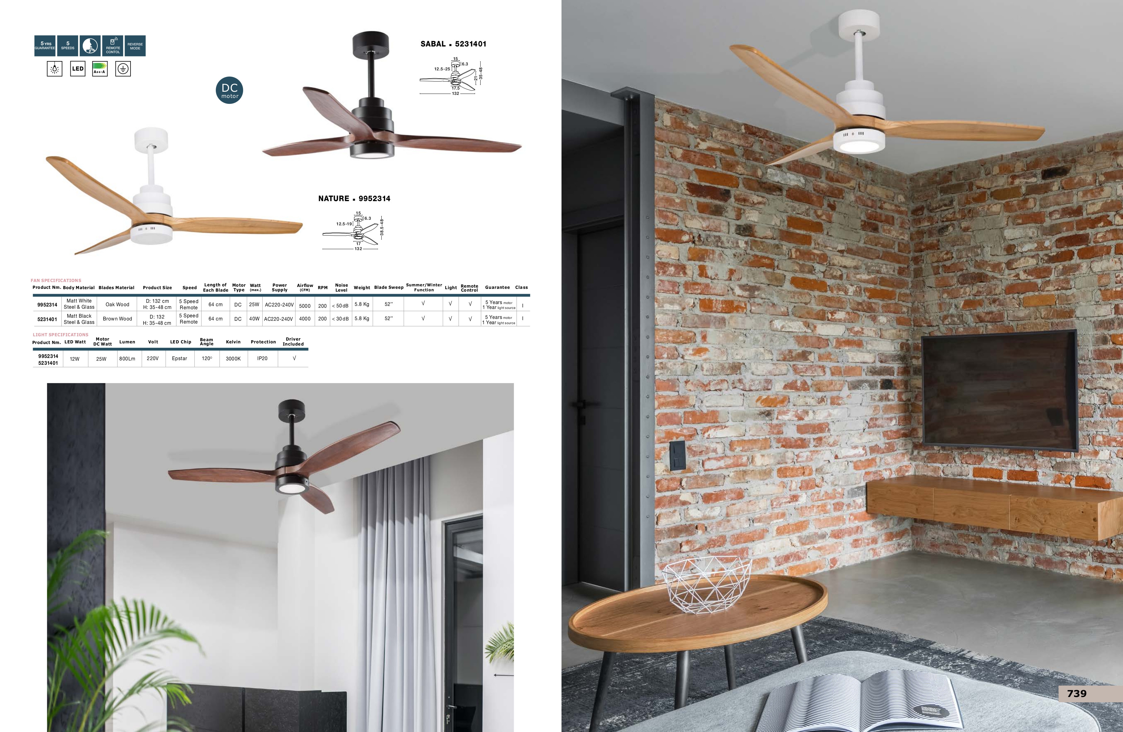 За стила и естетиката на интериора в изключително висока степен допринасят, както цялостната визия и дизайн на осветителното тяло, така и вложените в изработката висококачествени материали, като стомана в черен мат, стъкло, перки от тъмно дърво, DC мотор, дистанционно.