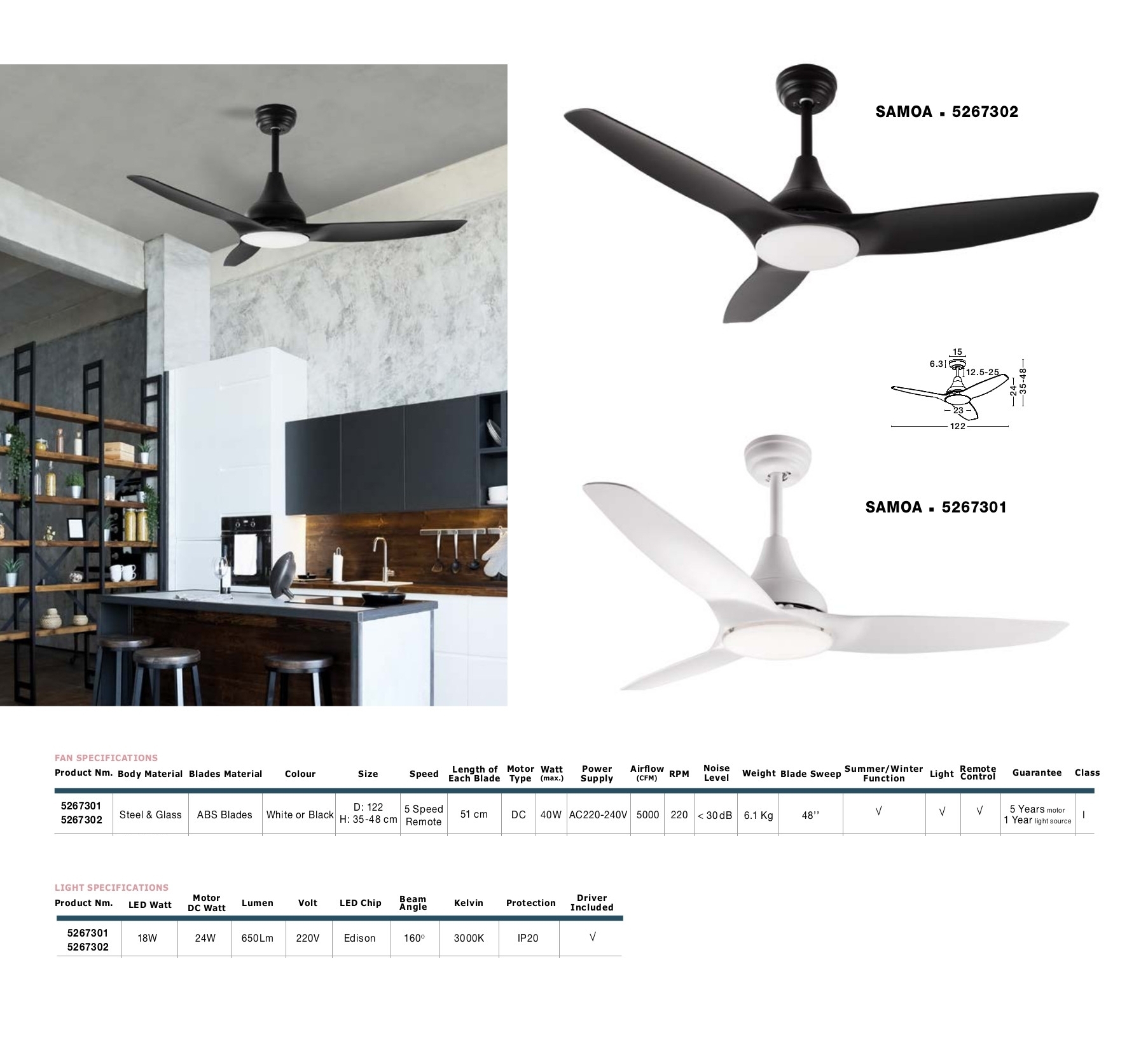 Осветителното тяло 5267302 ще осигури комфорт и естетика във всяко помещение, в което се постави. Цялостната визия и дизайн на лампата и вложените в изработката й материали, като метал в черен цвят, стъклен дифузер в матово бяло, перки от ABS в черно, DC мотор 40 W, ще допринесат за един неповторим стил. Благодарение на дългогодишния опит, качествените материали и строгия контрол на качеството на изработка на производителя Nova-Luce (Гърция), 5267302 е на високо европейско ниво.