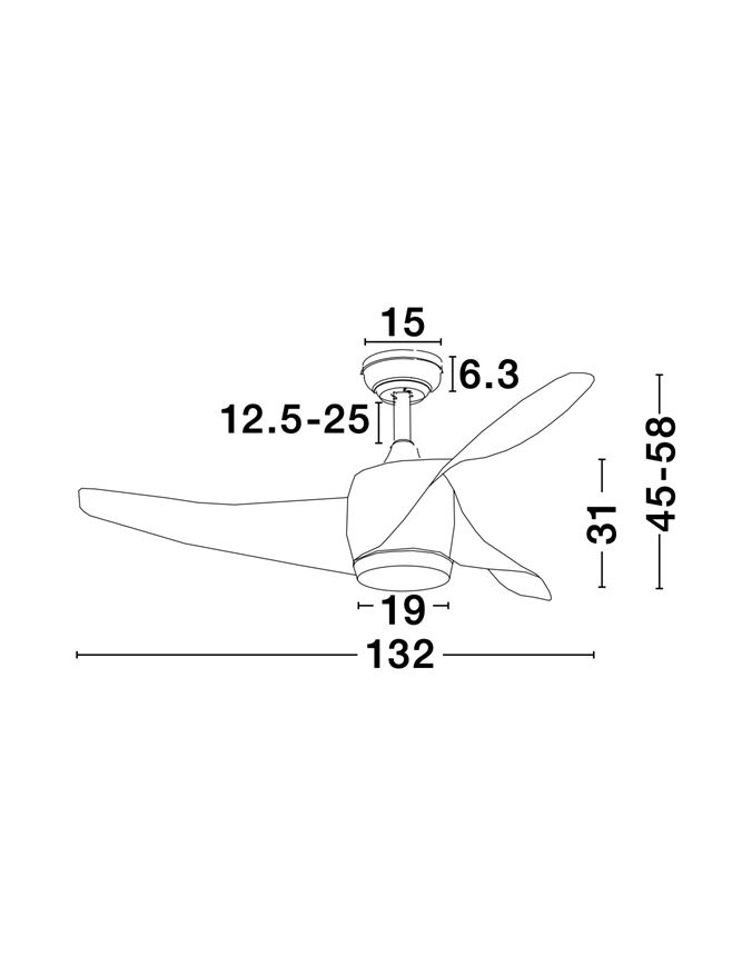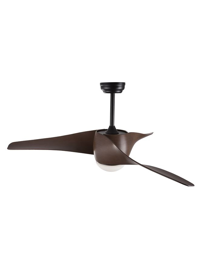 стомана в черен мат, стъкло, перки от полимер в цвят дърво, DC мотор, дистанционно