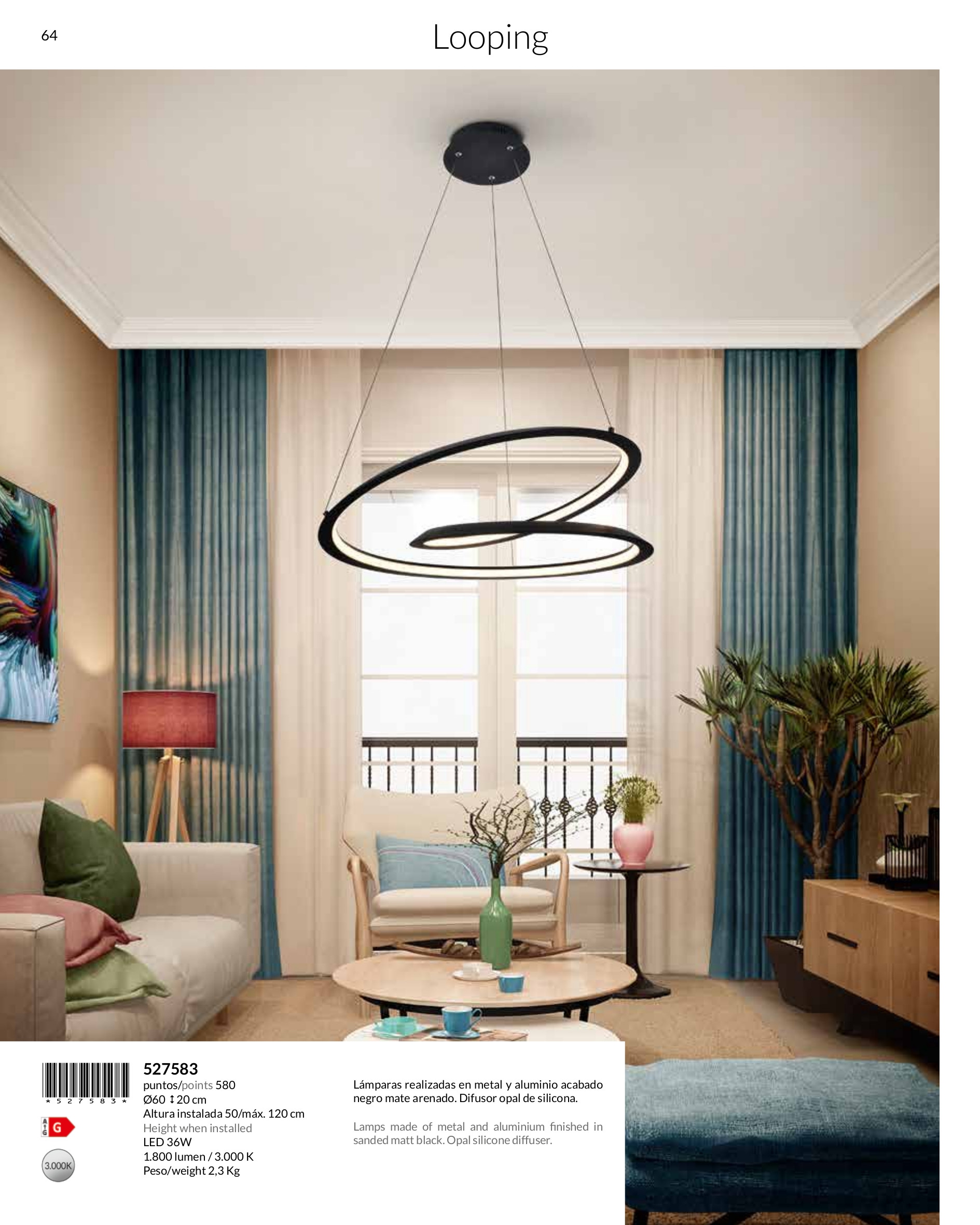 Лед полилей 527583 LOOPING nero d60 ще осигури комфорт и естетика във всяко помещение, в което се постави. Цялостната визия и дизайн на led лампата и вложените в изработката й материали, като метал и алуминий с матово черно покритие, дифузьор от опалово бял силикон, ще допринесат за един неповторим стил. Благодарение на дългогодишния опит в производството на лед осветление, качествените материали и строгия контрол на качеството на изработка на производителя Schuller (Испания), 527583 LOOPING nero d60 е на високо европейско ниво.