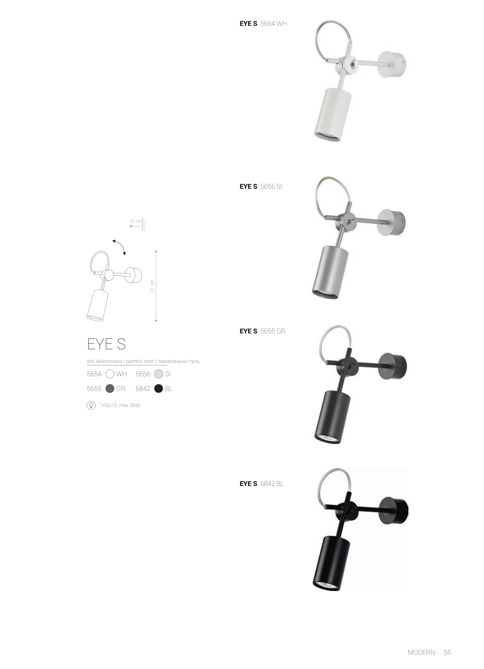 Осветителното тяло @5656 EYE silver I kinkiet S представлява аплик, спот лампа в съвременен стил. @5656 EYE silver I kinkiet S е от категорията осветителни тела и е подходящо за осветяване на различни помещения и пространства като: всекидневна / хол, спалня, кухня, трапезария, коридор, антре, стълбище, офис.